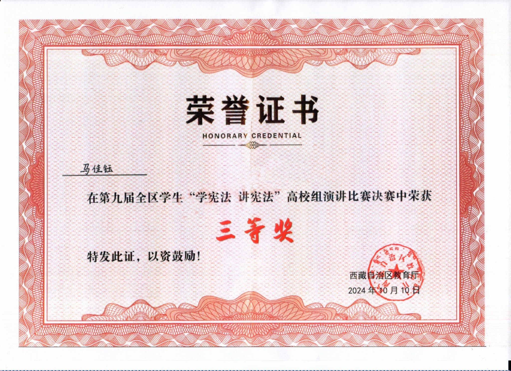 学校党委宣传部、各二级学院(部、所)高度重视并给予大力支持。各二级学院(部、所)精心组织初赛,分别选拔出一批具有宪法知识底蕴深厚、综合素质优良的选手,经党委宣传部严格筛选、综合考量,资源与环境学院马佳钰同学脱颖而出,被选定为我校参加西藏自治区第九届全区学生“学宪法 讲宪法”决赛的选手代表。