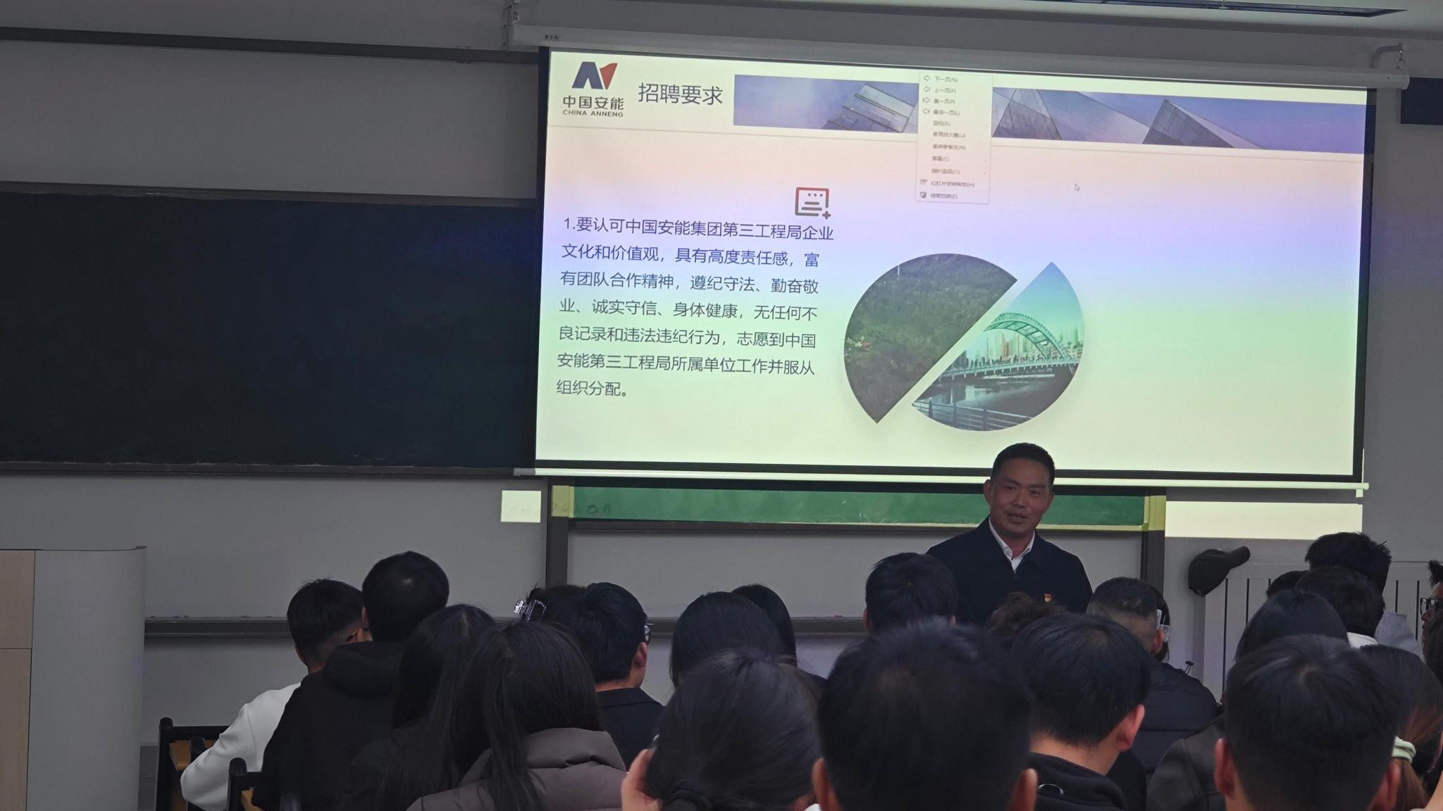 为更好拓宽高校毕业生就业渠道,高质量搭建用人单位与毕业生就业供需对接平台,促进我院2025届毕业生高质量充分就业,2024年10月22日下午,中国安能三局西藏分公司在我校6501教室举行校园招聘宣讲会。我校电气工程学院、水利土木工程学院、资源与环境工程学院150余名2025届毕业生参加了此次招聘会。