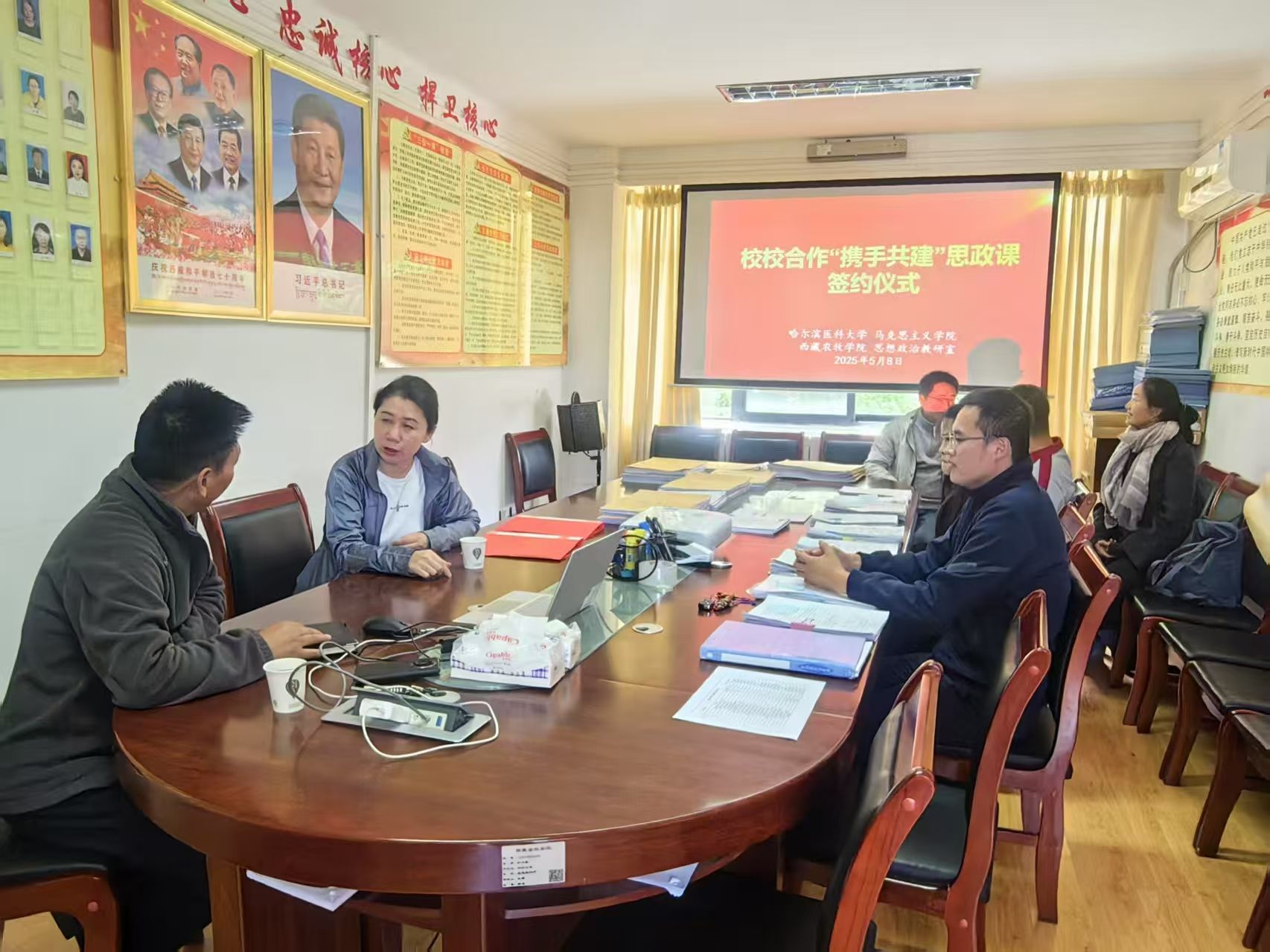 为深入贯彻落实习近平总书记关于高校思政课建设的重要指示批示精神,进一步明确职责使命,推动内涵式发展,强化政策保障,不断推进我校思政课标准化建设水平, 5月8日,我校思政教研室与哈尔滨医科大学马克思主义学院签署了合作共建协议。哈尔滨医科大学马克思主义学院院长李中华,我校党委委员、宣传部部长达娃次仁,思政教研室教师代表参加签约仪式。签约仪式在党委宣传部会议室举行,会议由达娃次仁主持。