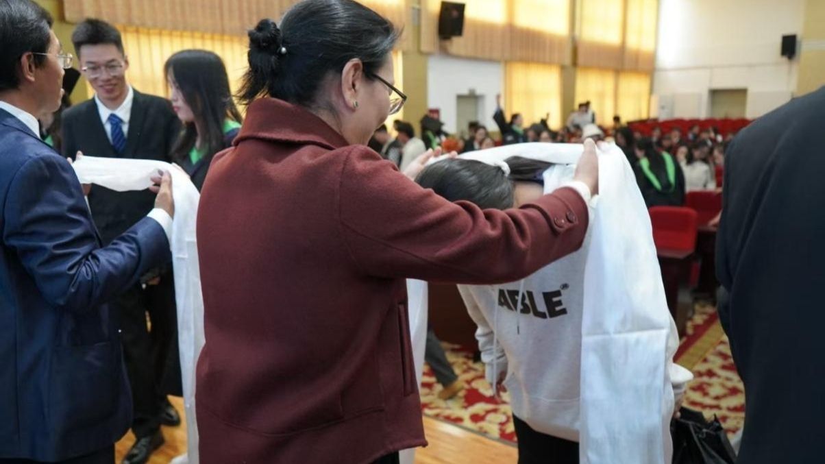会议结束后,与会领导与老师为全体毕业生一一献哈达,赠送毕业生礼包,并邀请学校领导同广大师生合影留念。