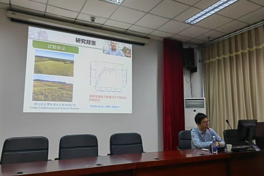 报告会上,赵磊副教授以《多样性与优势种对植物群落时间稳定性的影响机制》为题,结合生态观测数据与统计分析模型,层层递进地剖析了生物多样性与群落稳定性之间的复杂关系。他不仅系统阐释了物种丰富度、均匀度如何影响群落抗干扰能力,还通过案例实证,揭示了优势种在资源分配、结构维持中扮演的关键角色,为理解生态系统动态平衡提供了新视角。在互动环节,师生们围绕 “极端环境下土壤微生物多样性与稳定性”“气候对植物多样性与稳定性的影响”等踊跃提问,赵磊副教授结合自身研究经验,深入浅出地逐一解答,并分享了国际前沿研究动态。