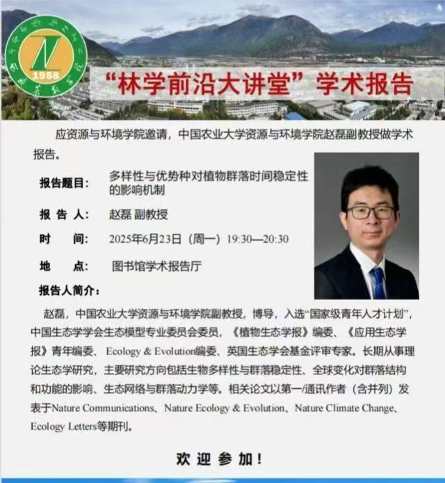 6 月 23 日晚,资源与环境学院林学博士点特邀中国农业大学赵磊副教授走进 “林学前沿大讲堂”,与学院师生展开深度学术交流。本次活动由学院副院长李耀明主持,林学等相关专业教师与研究生齐聚一堂,共同探索植物群落生态学领域的前沿奥秘。