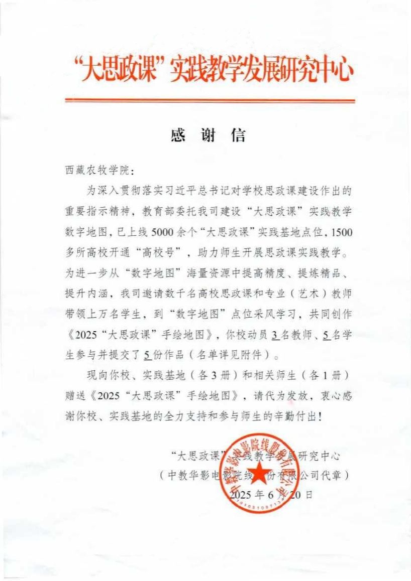 这封致谢信不仅是对我校师生团队数月辛勤付出的肯定认可,也是对马克思主义学院在思政课实践教学创新领域责任担当的激励鞭策。马克思主义学院将以此次获得感谢信为契机,进一步深化思政课实践教学改革创新,不断探索建立具有藏农大特色的思政课实践教学资源库,结合学校在生态文明建设领域的学科优势,打造一批融合“绿色发展”“生态文明”等元素的思政实践案例,丰富“大思政课”建设内涵,不断提升“大思政课”建设质量。