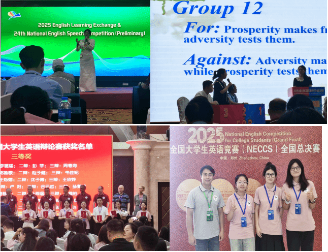 2025年8月2日——8月7日,2025年全国大学生英语竞赛(NECCS)全国总决赛在郑州成功举行。我校马克思主义学院(公共教学部)外语教研室莫永华老师带领我校生态学专业的郑芳洁、张元格和动物科学专业的彭菲同学等参加了该项赛事,并斩获了全国大学生英语演讲比赛二等奖和三等奖各1项、全国大学生英语风采大赛三等奖1项、全国大学生英语辩论赛三等奖1项,张元格同学被评为了优秀参赛选手,莫永华老师被评为优秀指导教师。