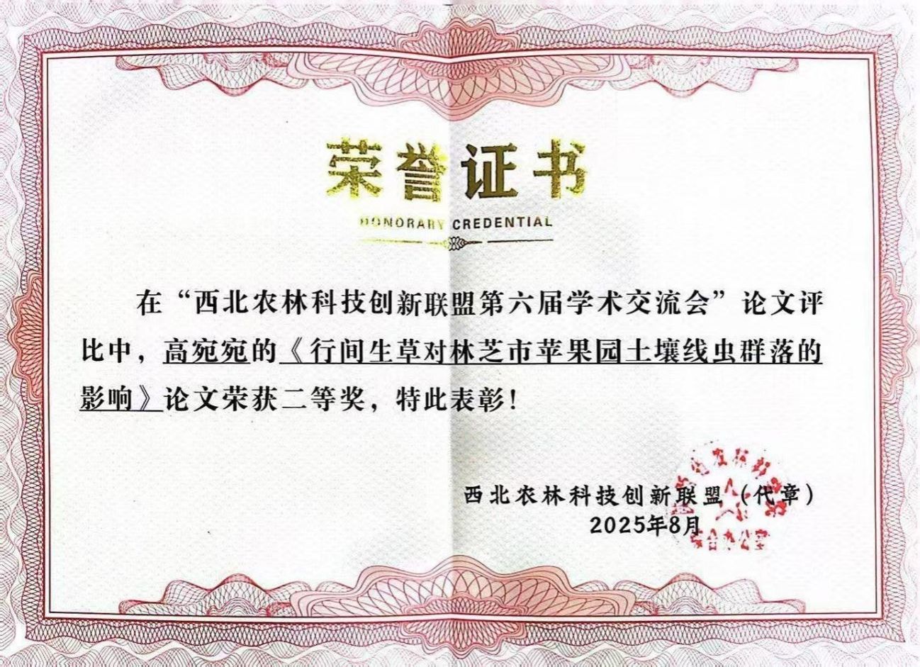 西北农林科技创新联盟是我国西北地区农林科研单位组成的科技联盟,旨在以西北自然资源条件、区域生态环境特征为基础,聚集农业科技优势资源和力量,创新机制、优势互补、资源共享、共赢发展,增强农业科技协同创新与转化应用能力,加强与中亚及阿拉伯国家的农业科技合作与交流,共同服务国家创新驱动发展和“一带一路”倡议,推进西北地区农业现代化进程。联盟此次会议主题为“聚力协同创新,赋能科研成果高校转化”,我校受邀参加。资源与环境学院侯磊副教授指导的2023级资源利用与植物保护专业研究生高宛宛同学投稿的研究论文《行间生草对林芝市苹果园土壤线虫群落的影响》经专家评审,获得会议优秀论文二等奖,并受邀进行了现场学术交流发言。