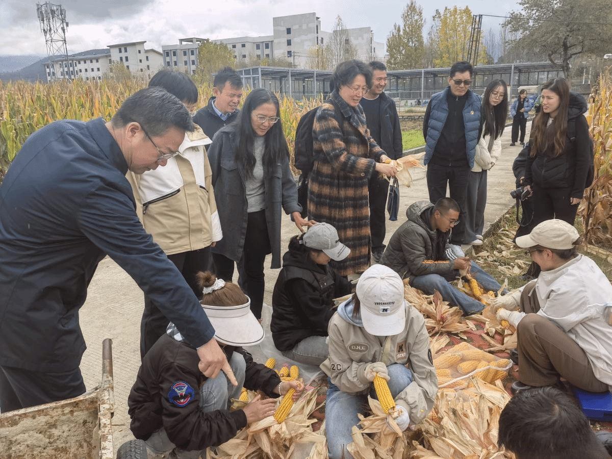考察组一行径直来到校内实习基地的玉米种植区。彼时,正值玉米样品收割关键时期,多名学生正有条不紊地进行玉米收割、脱粒、称重等实践操作,现场一派忙碌而有序的景象。领导们见状,主动走近学生群体,与正在劳作的学生亲切交流。