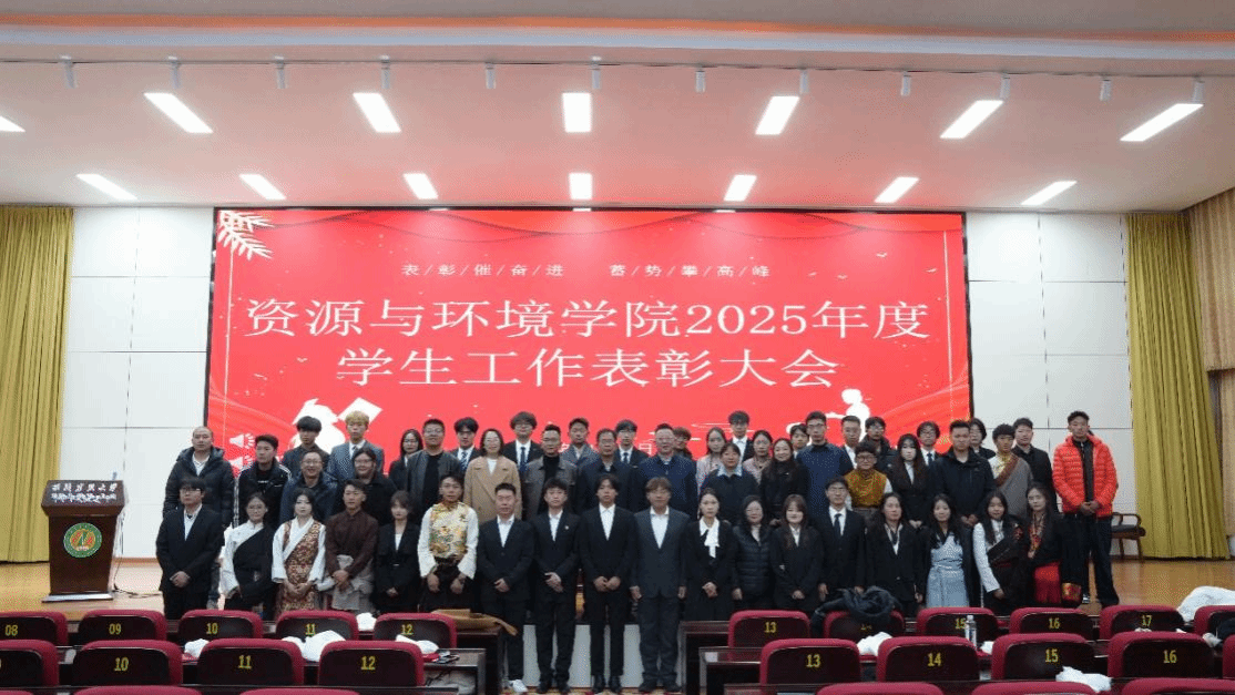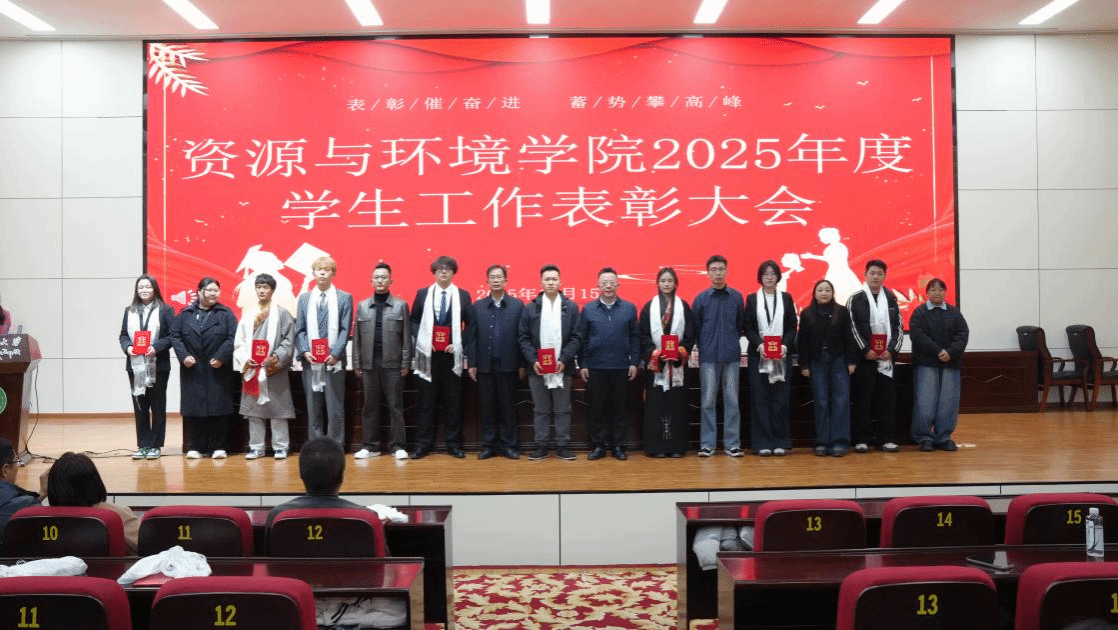 为激励学生干部不断提升工作能力,建设高素质学生工作队伍,推动学院学生工作再上新台阶,11月15日晚18:00时,“青春逐梦绽芳华,砥砺奋进启新程”资源与环境学院2025年度学生工作表彰大会在一号行政楼一楼会议室隆重举行。林草学院党委书记(原资源与环境学院党委副书记)邹联付、资源与环境学院党委副书记张洪斌、林草学院党委副书记扎西顿珠,学生辅导员、班主任代表以及党员工作站、团总支、学生会、社团成员和学生代表共同参会。会议由章国豪老师主持。