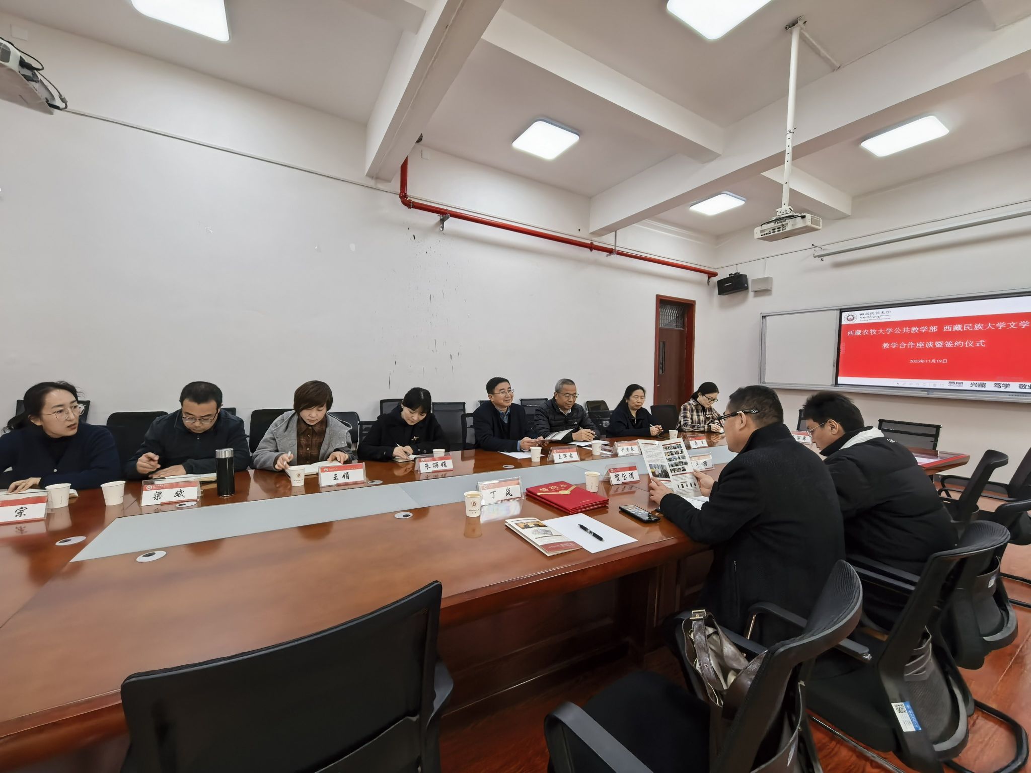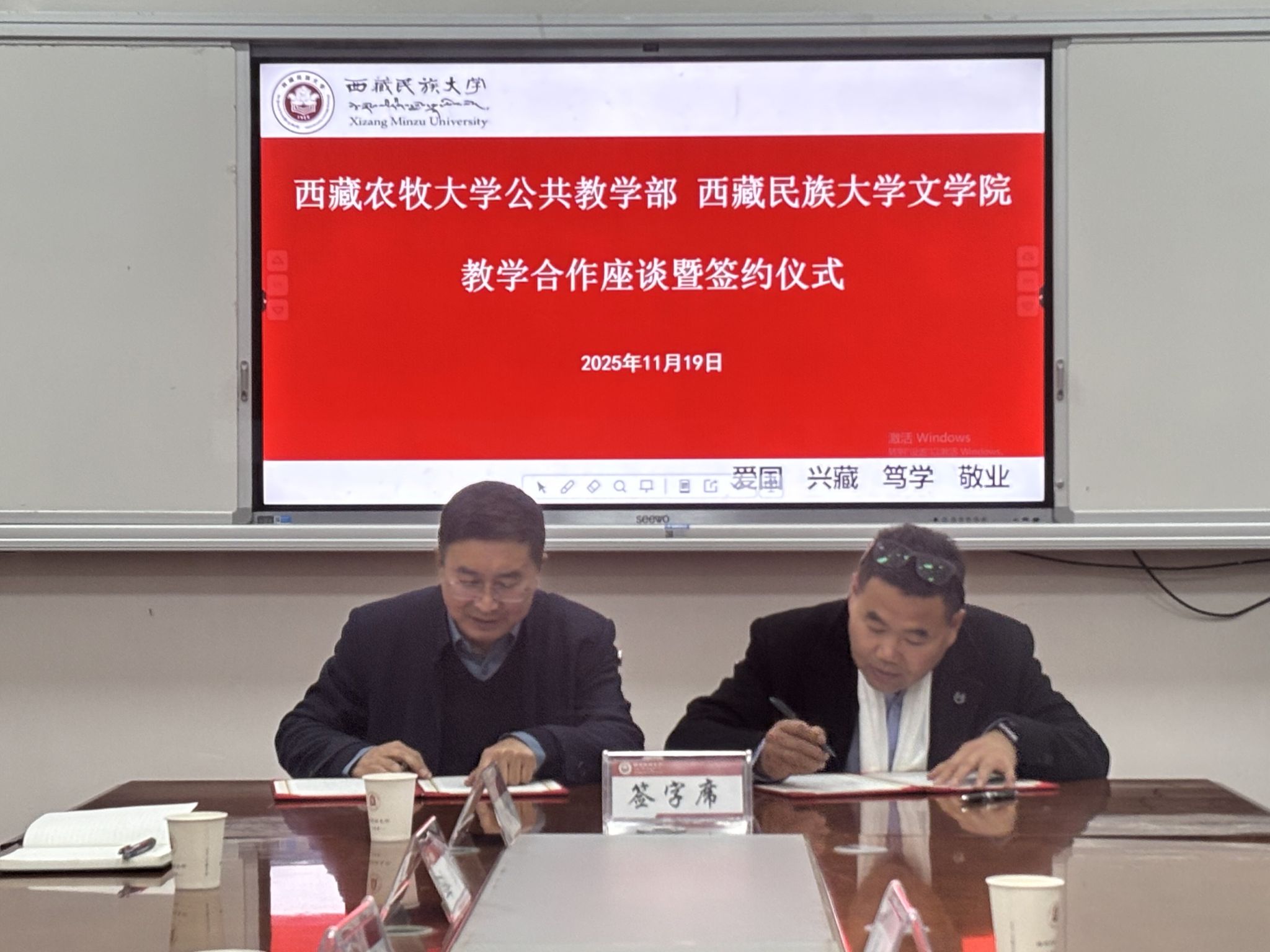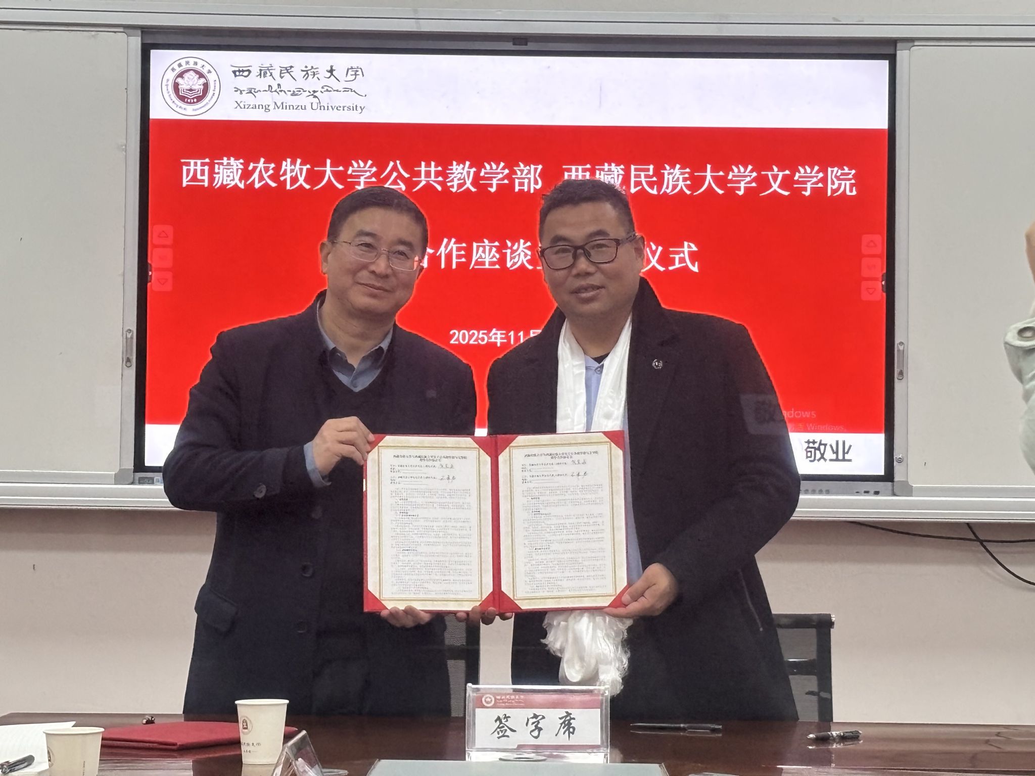 为深化校际教育教学交流合作,推动人文素养教育提质增效,2025年11月19日,西藏农牧大学公共教学部副主任贺玺浦一行3人到访西藏民族大学文学院,开展调研座谈并签署教学合作协议。