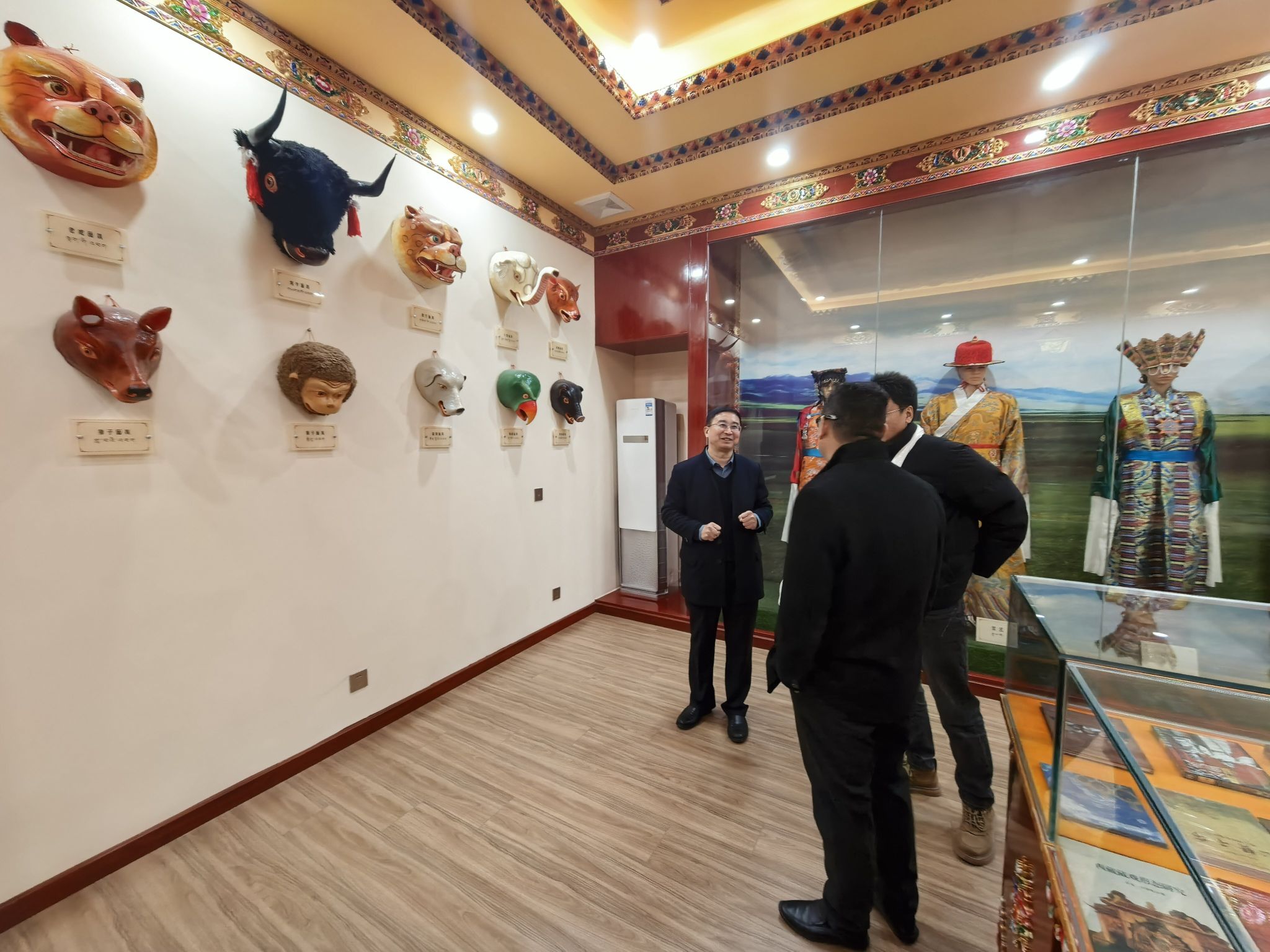 文学院王院长向贺玺浦一行人介绍藏戏艺术展示厅