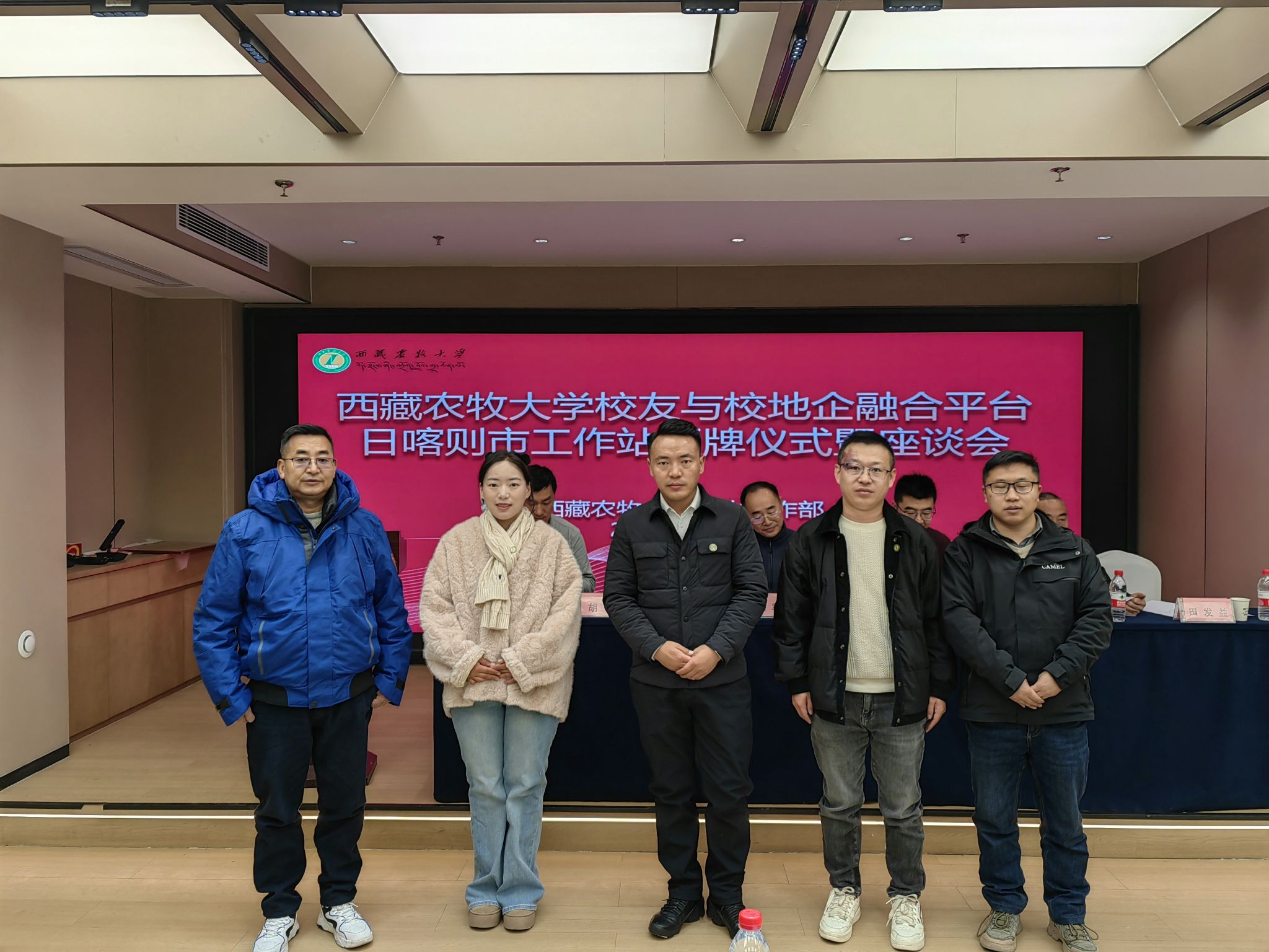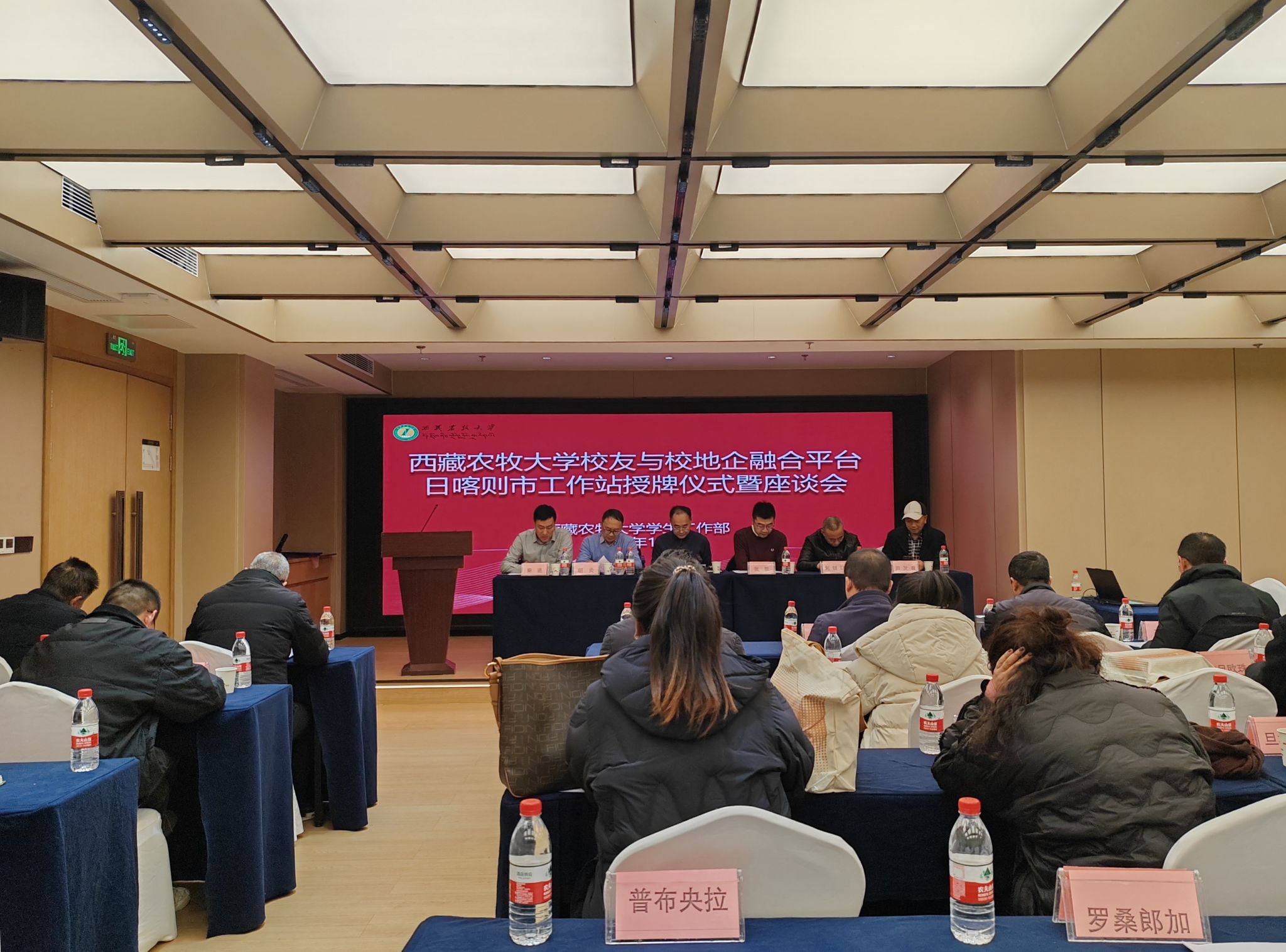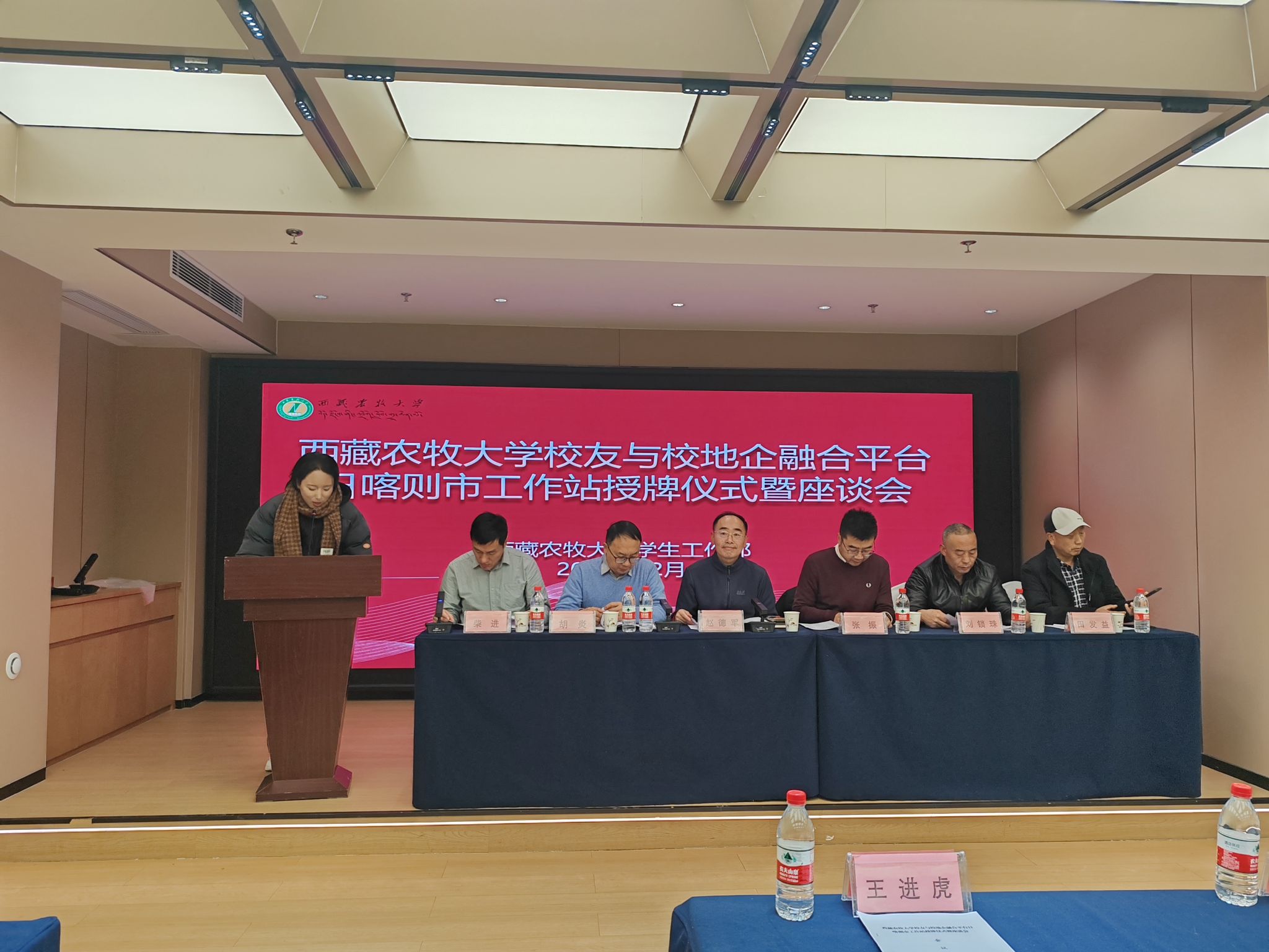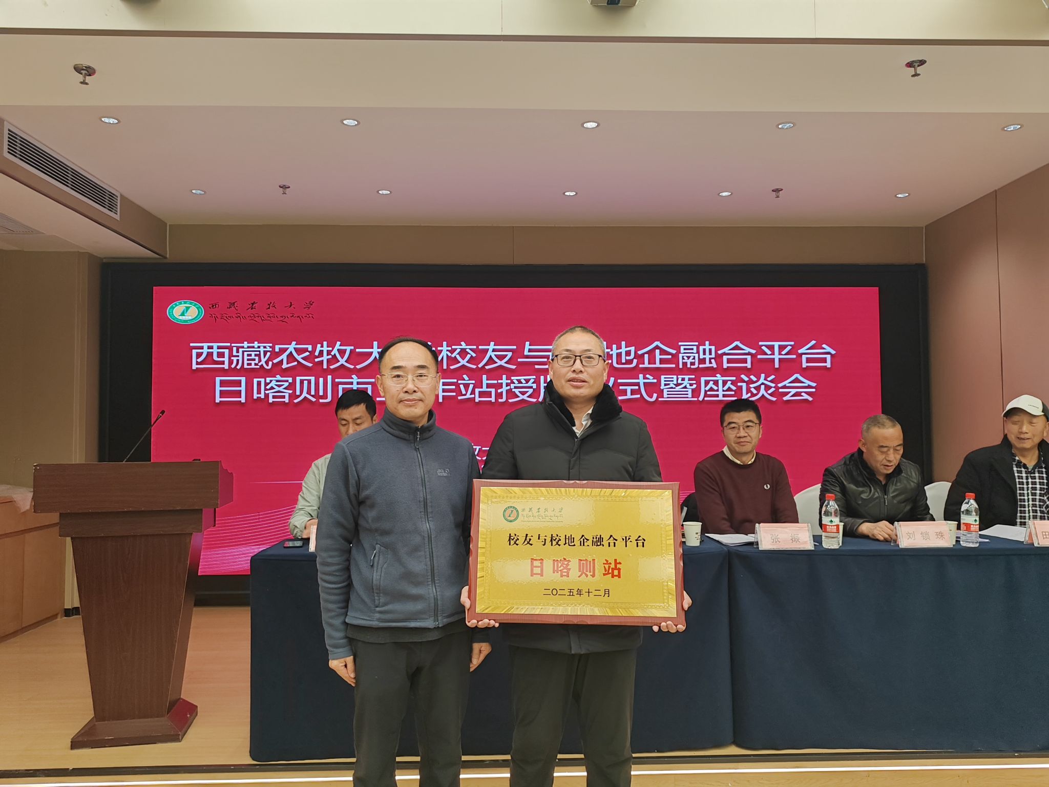 为加强校友联络,推进校地协同、校企合作、就业促进、科研公关等一体化平台建设,2025年12月20日上午,西藏农牧大学校友与校地企融合平台日喀则市工作站授牌仪式暨座谈会在日喀则举行。会议由西藏农牧大学学生工作部(处)长赵德军主持,学校相关职能部门负责人、教师代表,与日喀则市各界校友代表齐聚一堂,共同见证日喀则市工作站成立。