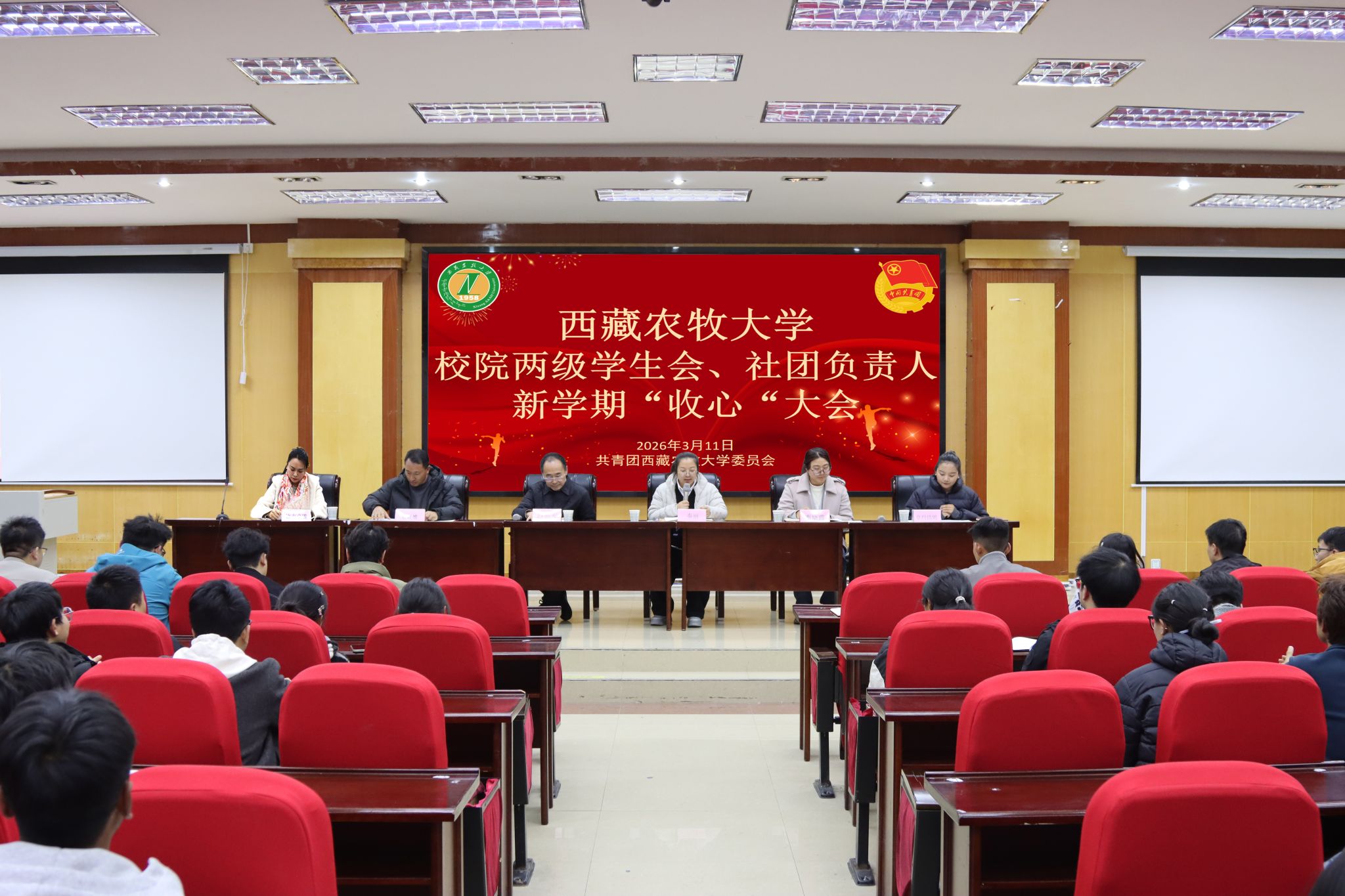 为引导学生骨干快速调整状态、明确新学期目标,强化思想引领、安全防范与使命担当,3月11日,校团委在研究生苑一号报告厅召开2026年西藏农牧大学校院两级学生会、社团负责人新学期收心大会。学工部部长赵德军、校团委书记普旺堆,校团委全体职工出席会议,校院两级学生会、全体社团负责人参会,会议由校团委副书记秦丽主持。
