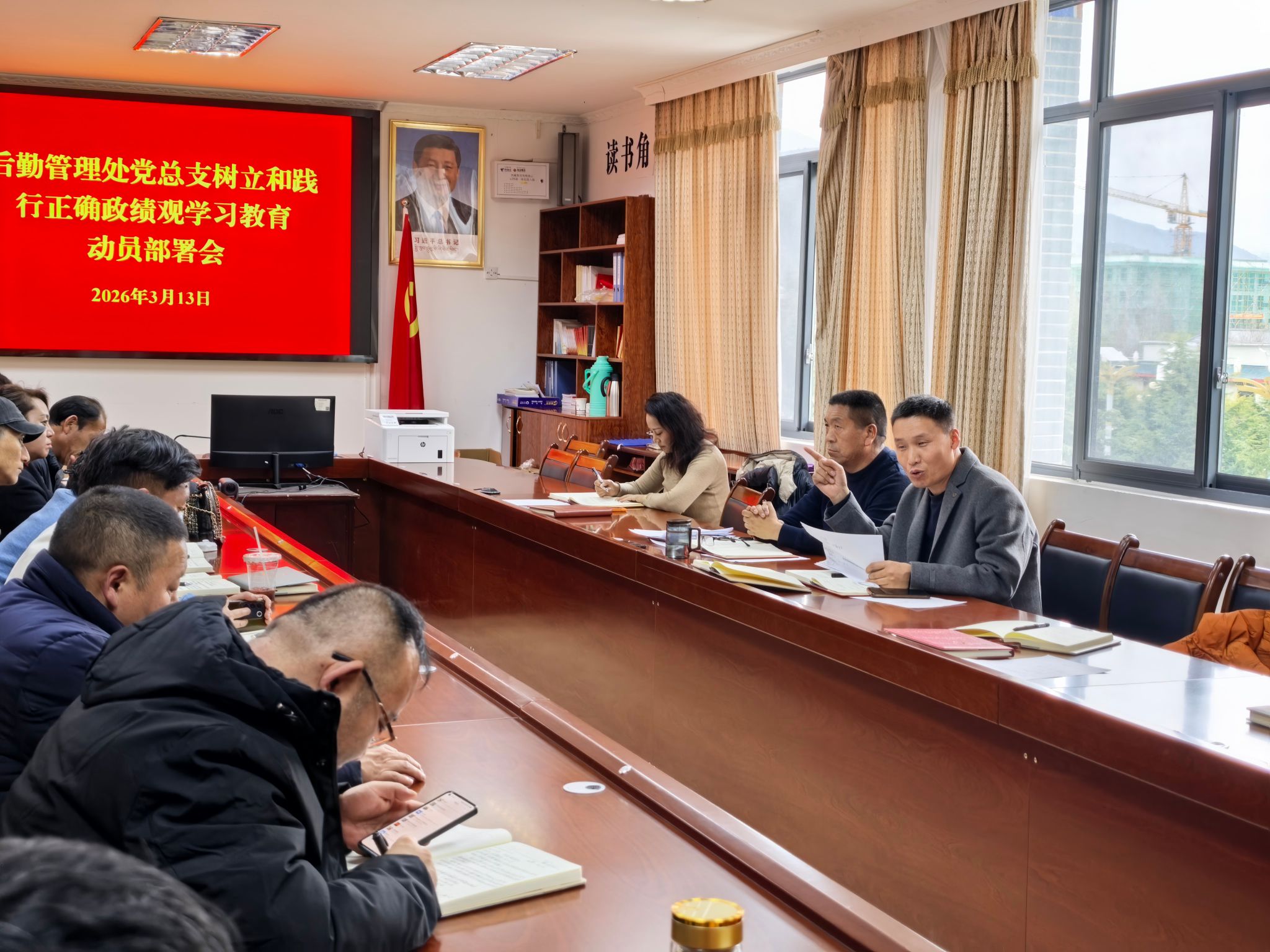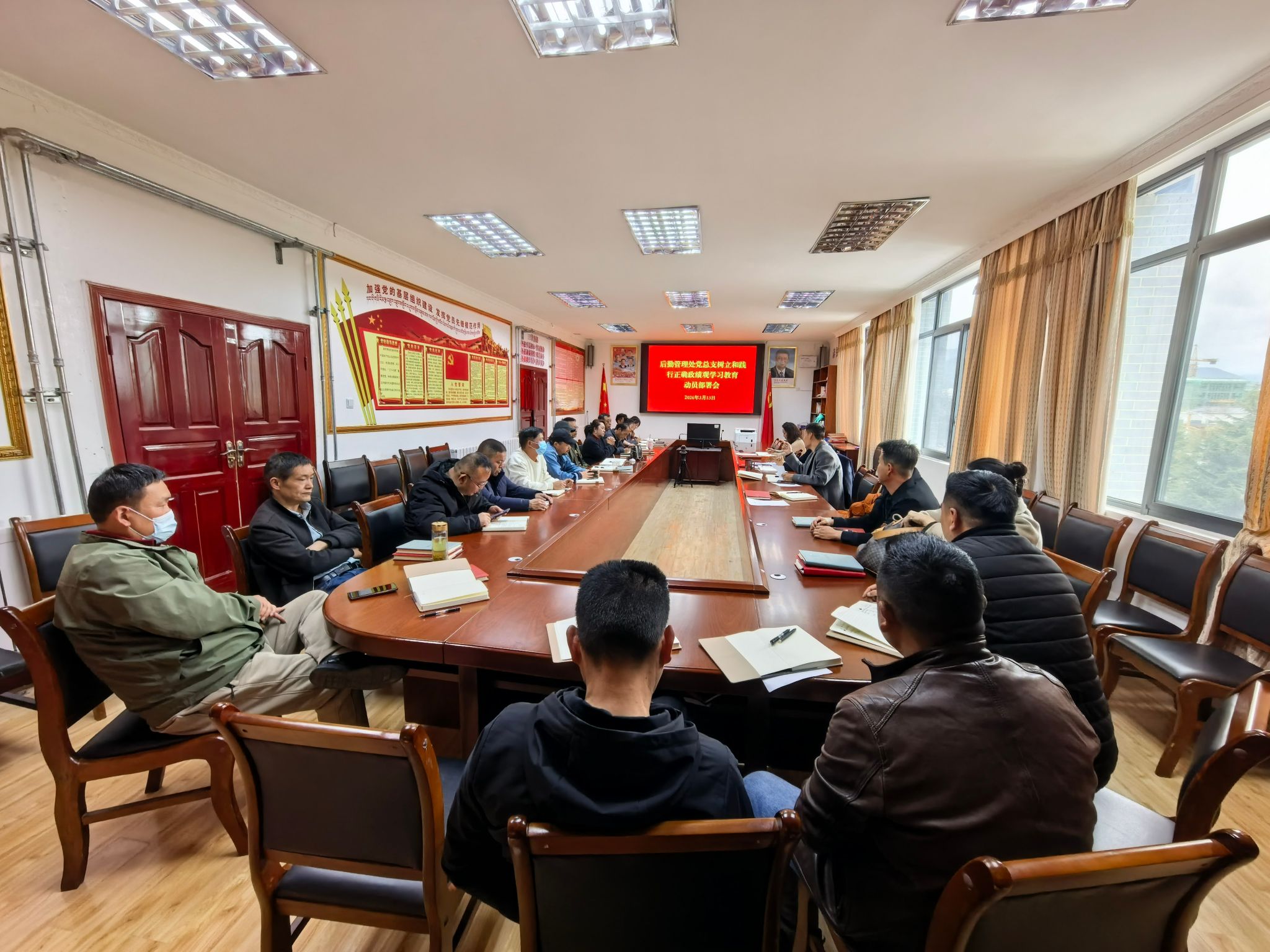 为深入学习贯彻落实习近平总书记关于树立和践行正确政绩观的重要论述,切实把思想和行动统一到学校党委的决策部署上来,3月13日,后勤管理处党总支召开树立和践行正确政绩观学习教育动员部署会,对全处学习教育工作进行全面安排部署,会议由后勤管理处党总支书记普穷主持,全处党员及干部参加会议。