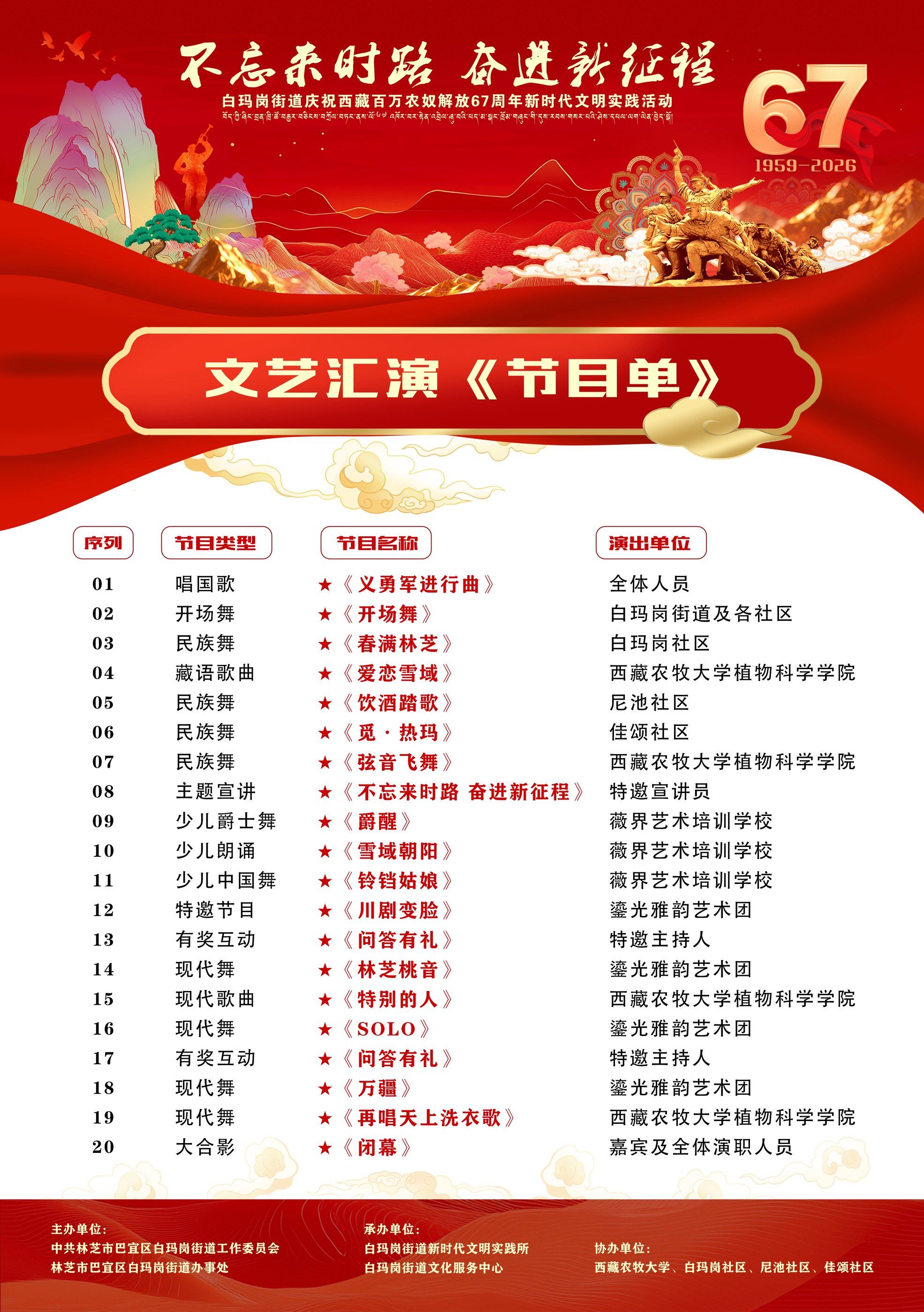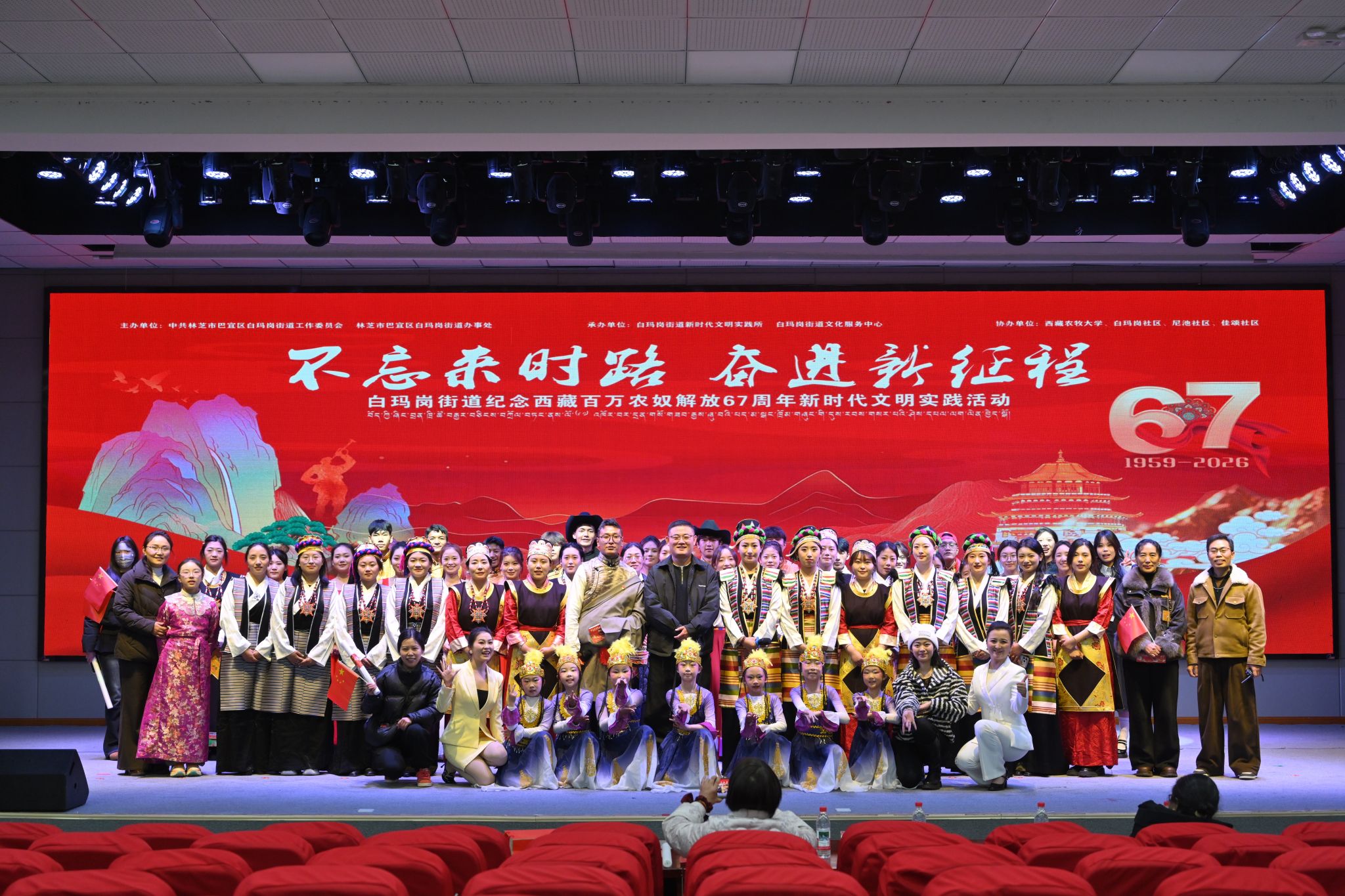 为隆重纪念西藏百万农奴解放 67 周年,深入学习党的光辉历史,传承红色基因,厚植爱国主义情怀,铸牢中华民族共同体意识,2026年3 月 28 日,西藏农牧大学植科学院受邀参与林芝市巴宜区白玛岗街道举办的“不忘来时路 奋进新征程”新时代文明实践主题文艺汇演活动,以青春之声献礼时代,以文艺之美凝聚奋进力量。