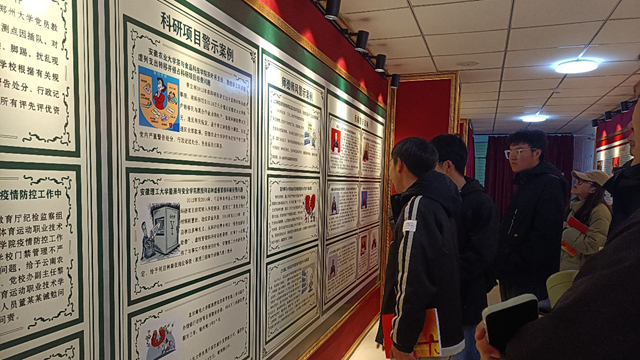 同学们在观看中长知识,在交流中增共识,在活动中受教育,党员和积极分子驻足两个场地展板前面认真学习领会宣传内容,对党的诞生、光辉历史、严格遵守党纪党规、强化勤政廉政意识、不断加强党风廉政建设和反腐败斗争方面得到了很好的一次集中教育学习。