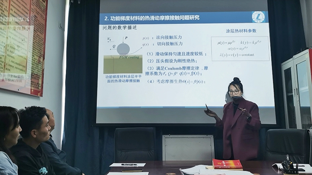 8月18日上午,华中农业大学刘静老师在公共教学部支部活动室,以“功能梯度材料热弹性摩擦接触问题研究”为题作了学术交流研讨报告。刘静老师是我校第七批柔性人才,工学博士,副教授,硕士生导师,已主持国家自然基金两项。