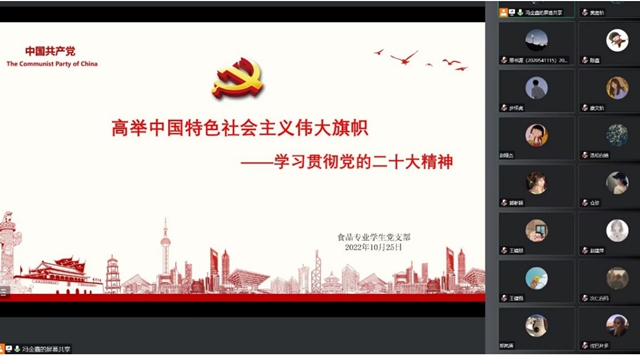 金秋十月,喜庆盛会。党的二十大报告振奋人心、催人奋进,学习宣传贯彻党的二十大精神是当前和今后时期的首要政治任务,为做好党的二十大精神理论阐释、学习宣传、宣讲教育各项工作,食品科学学院食品专业学生党支部于10月25日下午组织开展“高举中国特色社会主义伟大旗帜”二十大精神学习宣传活动,此次活动以线上集体学习方式开展,全体党员、入党积极分子参加学习。