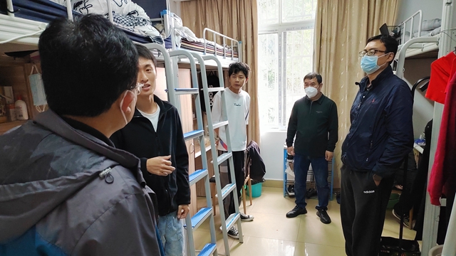 走访过程中,领导询问了研究生“几年级了?”、“导师是哪位老师?”、“这几天和导师沟通了吗?”、“研二学生开题报告准备好了吗?”、“研三的科研上有哪些成果了?”、“论文发表了吗?”、“英语四六级考的怎么样?”、“疫情期间在校生活还有什么困难”?······每到一个宿舍,都与同学们逐一亲切交流;王军副处长对同学们比较关心的英语四六级考试进行了交流。