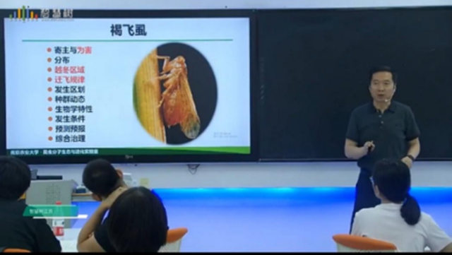 慕课上,洪教授从水稻害虫切入,介绍褐飞虱、灰飞虱、白背飞虱等三种重要稻飞虱的形态特点与危害情况,提到长江中下游是稻飞虱重点的为害区域,并从飞虱的危害特征、分布、越冬区域、迁飞规律、发生区划、种群动态、生物学特性、发生条件、预测预报、综合治理等十个方面对飞虱进行了详细讲解。课堂上,三校师生共在线上、学在其中,积极互动、有问有答,课堂生动活跃、气氛融洽。