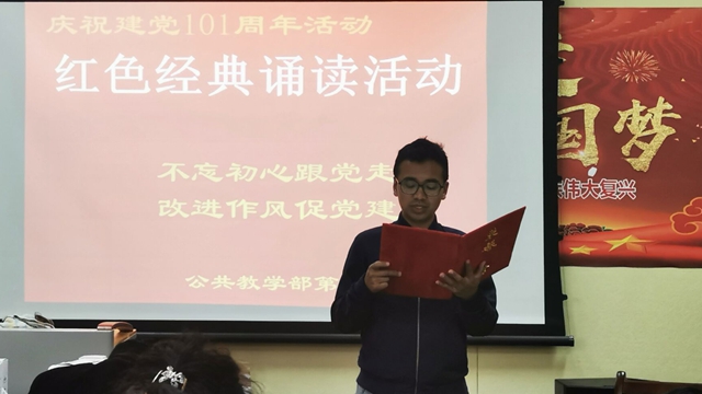 教工第一党支部开展了不忘初心跟党走、改进作风促党建---庆祝中国共产党成立101周年主题党日红色经典诵读活动,诵读红色经典活动以红色相伴,与经典同行,让广大党员重拾峥嵘岁月里的记忆,重温革命历史的情怀。不仅使广大党员感受到红色经典的魅力,更让红色精神得到更好地传承和发扬。