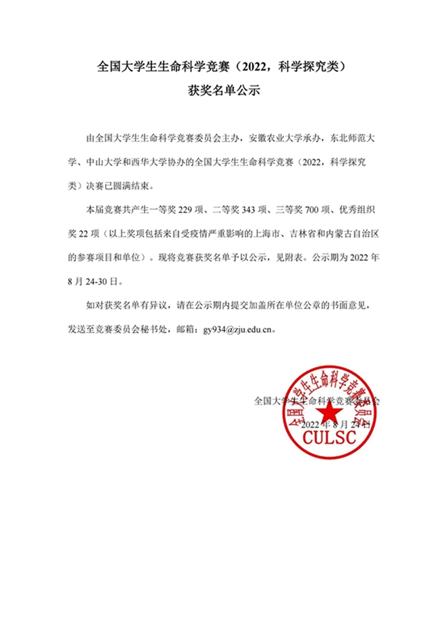 全国大学生生命科学竞赛是由教育部高等学校大学生物学课程教学指导委员会、教育部高等学校生物科学类专业教学指导委员会等多家单位共同倡议举办的全国性学科竞赛,覆盖面积广、参与人数多、对参赛项目要求高,是生命科学领域最具影响力的国家级大学生学科竞赛之一,2021年被列入了中国高等教育学会发布的《全国高校学科竞赛排行榜》。本届竞赛有来自全国31个省份528所高校的8614个团队参赛。通过初赛网络评审、省级决赛选拔,入围团队进入全国决赛,通过大赛评委会审定,决出一等奖229项、二等奖343项;按省赛成绩产生三等奖700项。
