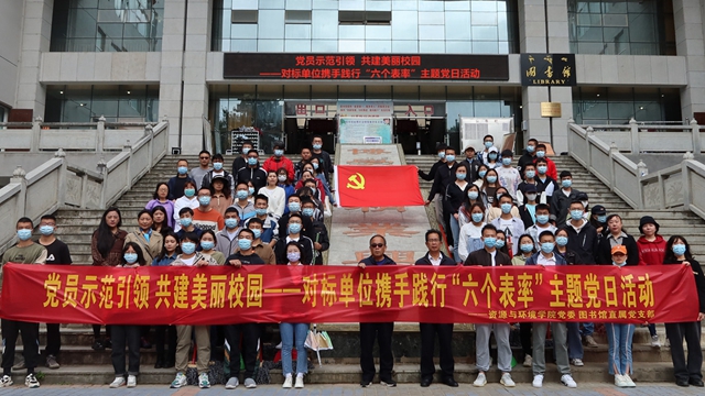为了充分发挥党支部的战斗堡垒作用和党员的先锋模范作用,引导广大党员和干部职工积极参与到改进作风狠抓落实工作中来,以实际行动践行“六个表率”,扎实推进改进作风狠抓落实工作,营造学习先进、赶超先进的风尚和积极向上的氛围,形成比学赶超的生动局面,图书馆直属党支部与对标单位(资源与环境学院党委)携手开展以“党员示范引领 共建美丽校园”为主题的党日活动。
