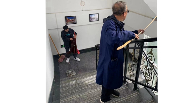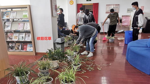讲话完毕后,根据此次主题党日活动的实施方案,由图书馆的党员带队,分为五组,领取打扫工具后,分别针对图书馆的厕所、开水房、楼道、绿植、书架以及墙壁蛛网等责任区域进行大清理,在打扫过程中,大家不怕脏不怕累,积极踊跃地参与到劳动中去,将各自责任区进行了全面的打扫,刷洗厕所,清洗开水房,修剪清理绿植,清扫蛛网等,经过两个小时奋战,图书馆的环境焕然一新,得到了在馆读者的一致好评。