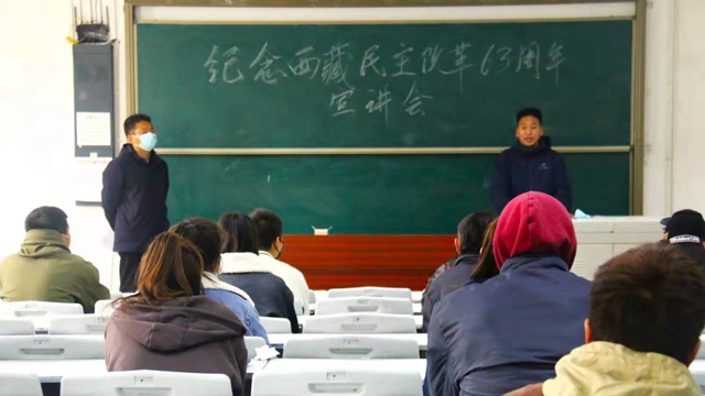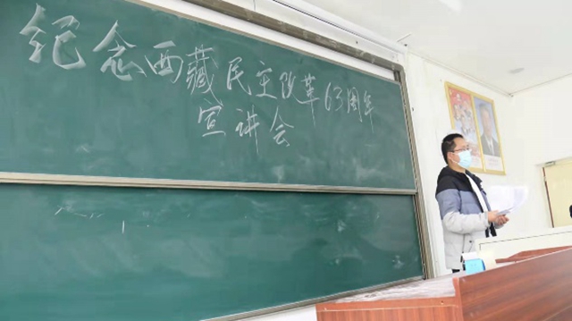 随后,普布次仁就纪念西藏民主改革63周年主题进行宣讲。民主改革使西藏重获新生,在中国共产党的英明领导下,西藏结束了内部长期混乱和纷争,经济社会发展呈现新气象,发生新变化。普布次仁呼吁同学们珍惜来之不易的幸福生活,并提醒同学们做好防疫工作,注重个人卫生,严防春季多发疾病。