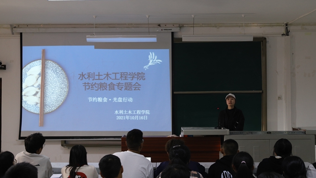 10月16日,水土学院在第四教学楼101教室组织开展“节约粮食 光盘行动”主题大会,各班级学生代表及主要学生干部参加了此次活动。 大会上,团总支副书记周小燕带领大家学习了习近平总书记关于制止餐饮浪费的重要精神,传达了学院厉行节俭、拒绝“剩”宴的倡议和要求,通过讲述“杂交水稻之父”袁隆平的光荣事迹,号召同学们牢记总书记的谆谆教导,树立正确价值观,节约为荣,浪费为耻,按需择量,理性选择,以自身的实际行动参与到文明校园的构建中去,切实践行社会主义核心价值观,提高自身修养,争做合格大学生。紧接着全角度、多维度地阐述了时下习近平总书记再次强调遏制“舌尖上的浪费”的紧迫性,结合身边真实情况和事例,言明了让勤俭美德入脑入心见于行的重要性,全面营造浪费可耻,节约为荣良好校园风气,大大提高了同学们对“光盘行动”的理解程度和配合意识。