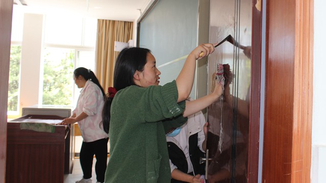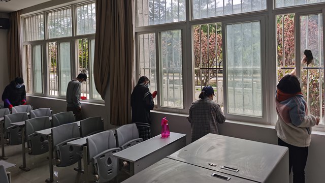 检查过程中,辅导员次仁措认真检查各个教室的窗台、教室死角、讲台等位置的打扫情况,对于打扫不彻底、存在明显垃圾的教室,联系了负责该教室的同学,并一对一的耐心指导,让同学们将不合格的地方进行再清扫。遇到教室较大、打扫卫生的人员较少的情况,索朗才旺副书记和辅导员巩雪梅主动戴上清洁手套加入了大扫除的队伍当中,和同学们一起清理桌面上的污渍、窗台上的垃圾。最后,索朗才旺副书记总结道干净整洁的环境有利于大家的学习,对大家的身心健康也有一定的帮助,所以希望大家时刻都要保持教室的干净整洁。