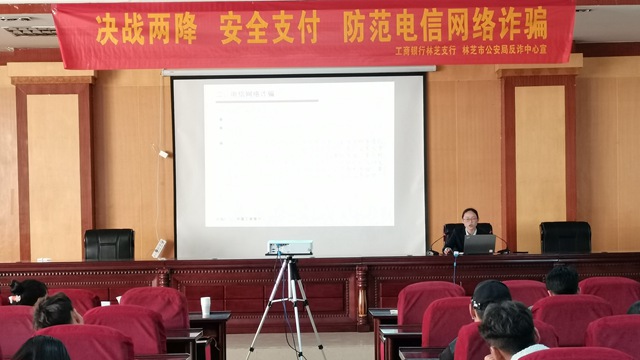 为了提高广大学生识别和防范电信诈骗的能力,使防范电信网络诈骗知识更好地入耳、入脑、入心。10月29日中午,我校特邀请林芝市公安局反诈中心与中国工商银行林芝支行开展了以“决战两降,安全支付,防范电信网络诈骗”为主题的大学生防范电信诈骗知识专题讲座。