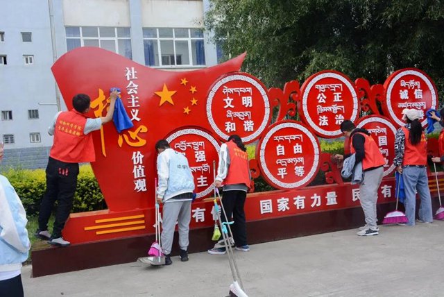 活动开始时,各位志愿者志愿者们都按照计划在规定的时间来到活动现场,参加今天的活动,起到很好的模范作用,同时,对青年志愿者部部长格桑卓嘎也对本次活动也作了具体的安排:一开始由全体成员对校园内一些比较明显的垃圾进行清扫、之后将人员分3组对校园内各个区域的卫生死角及路标、指示牌等进行打扫。同学们经过2个小时的辛勤打扫,终于营造了一个卫生舒适的校园环境。