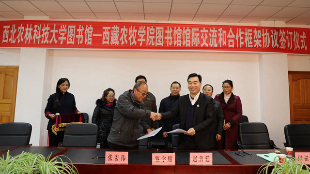 为更好地贯彻落实国家“一带一路”战略和中央第六次西藏工作座谈会精神,促进科技、人才合作交流,在我院援藏干部科研处副处长杜世平的促成及我院领导和西北农林科技大学领导的支持下,12月19日下午, 我校图书馆与西北农林科技大学图书馆在我校图书馆会议室签署合作协议。西北农林科技大学党委副书记闫祖书、图书馆馆长赵善廷,西藏农牧学院党委委员、副院长郭永刚,图书馆馆长张宏伟、副馆长唐兰,以及各科室负责人出席了签约仪式,科研处副处长杜世平主持签署会议。