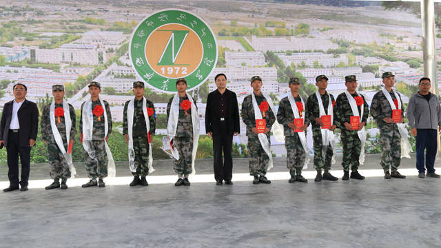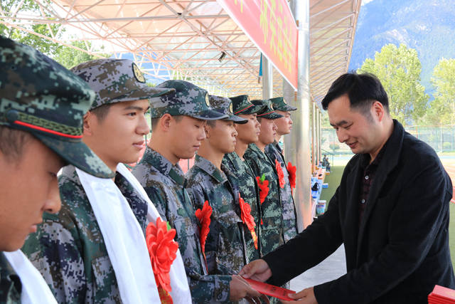 为了积极鼓励我校学生参军入伍、报效祖国,9月9日下午在体育场,隆重举行了我校2019年度入伍学生表彰暨欢送仪式。学校党委副书记王从严为入伍学生代表颁发表彰证书,学生工作处处长赵德军致欢送辞、学生工作处副处长贺玺浦同志为入伍学生代表佩戴了光荣红花。2019级全体军训学生参加此次活动。
