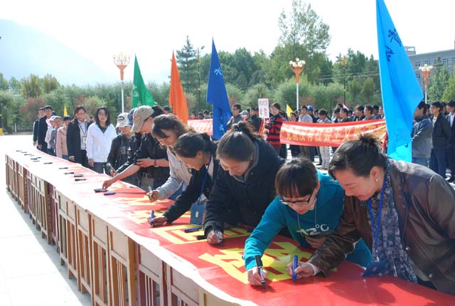 师生员工在“爱国爱校 、公德先行、文明从我做起”横幅上签名