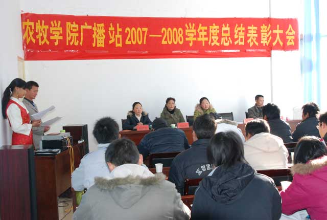 2008年11月24日上午10时,院广播站在2号教学楼会议室举行2007——2008学年度总结表彰大会,院党委委员、副院长周秀英出席会议,各二级学院、院党委宣传部的党政领导代表、各社团负责人及全体站员参加了会议。