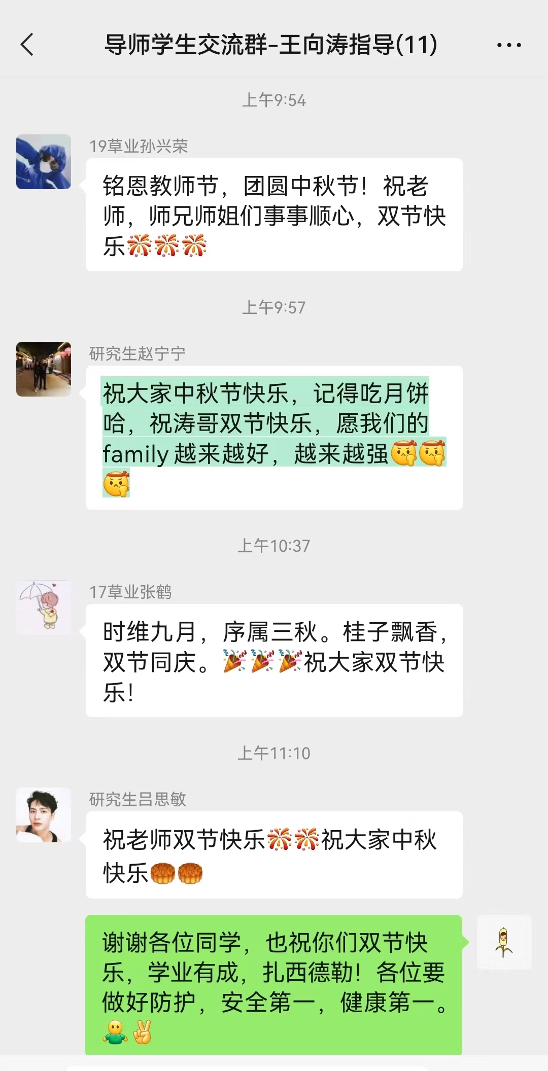谈起双节怎么过时,王向涛说:“往年教师节都是在学校里和学生们一起过,很快乐。今年虽然不能见到学生们,但是我和学生已经商量好了,我们晚上一块上一堂线上分享课,一起在线赏月吃月饼,分享各自学习生活的心得体会,我觉得这样也是很有意义的。”