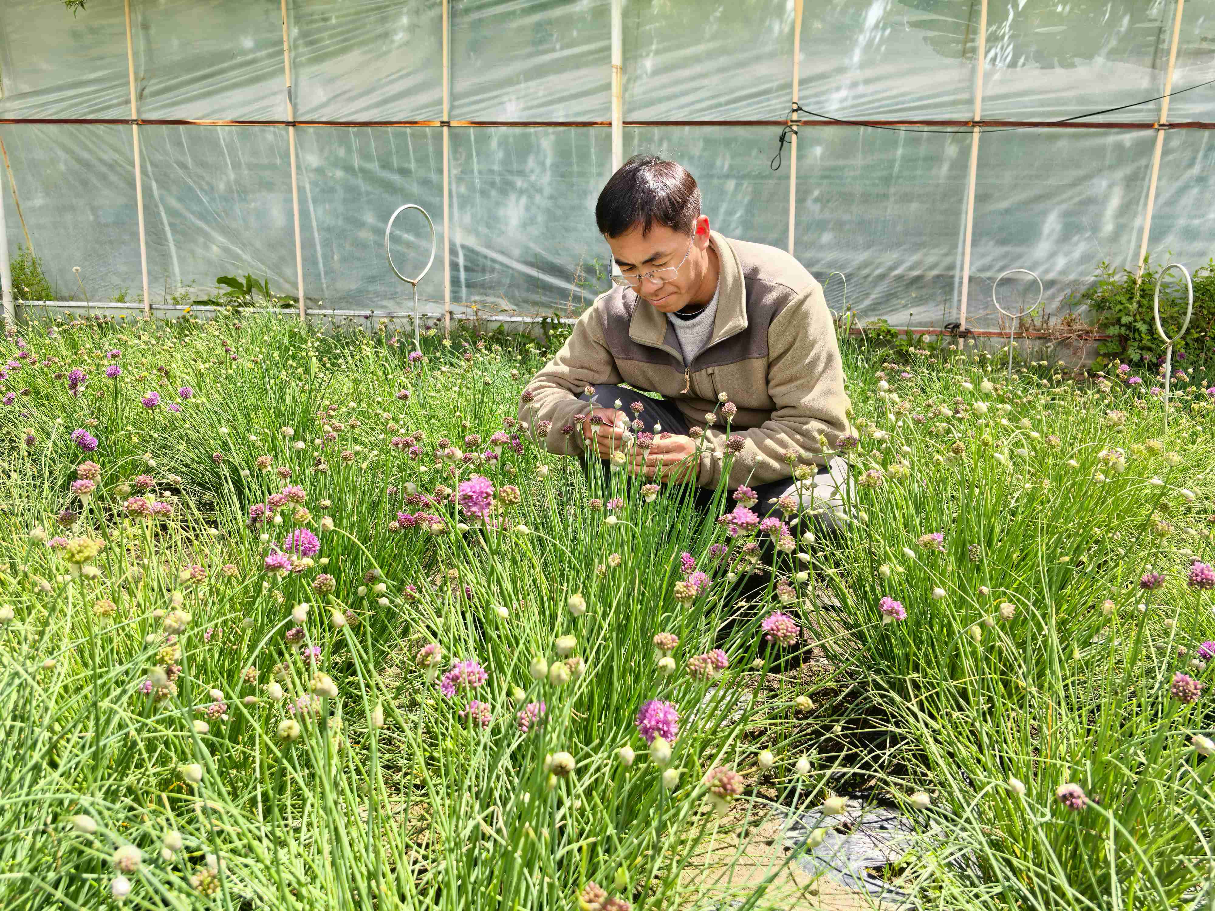 王忠红在人工栽培的青甘韭地里,测量花的大小。
