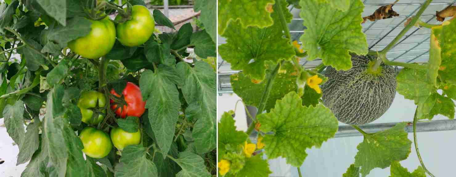 王忠红在立体栽培设施内种植的番茄和甜瓜。