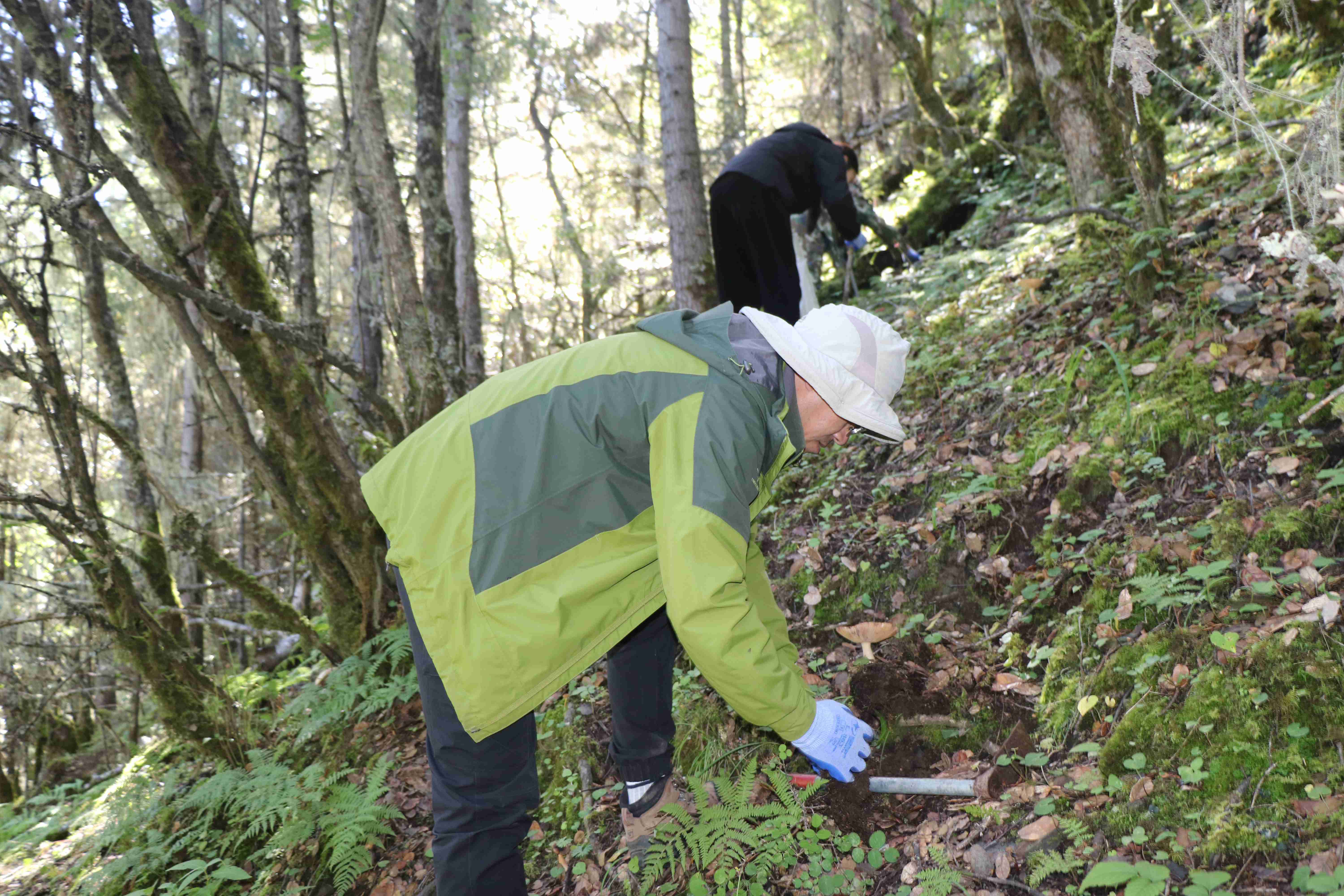 王忠红在林下调查野生葱属植物资源。