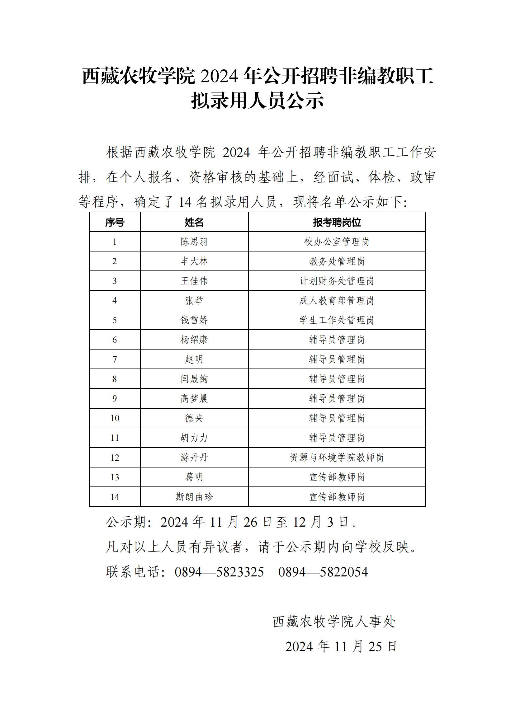 西藏农牧学院2024年公开招聘非编教职工拟录用人员公示