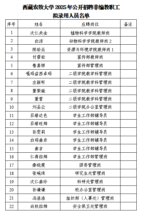 根据《西藏农牧大学非编教职工招聘公告》要求,经资格审核、两轮面试、体检及政审等程序,确定次仁央金等22名同志为拟录用人员,现予以公示。如对公示人员有异议,请于公示期内向学校反映。