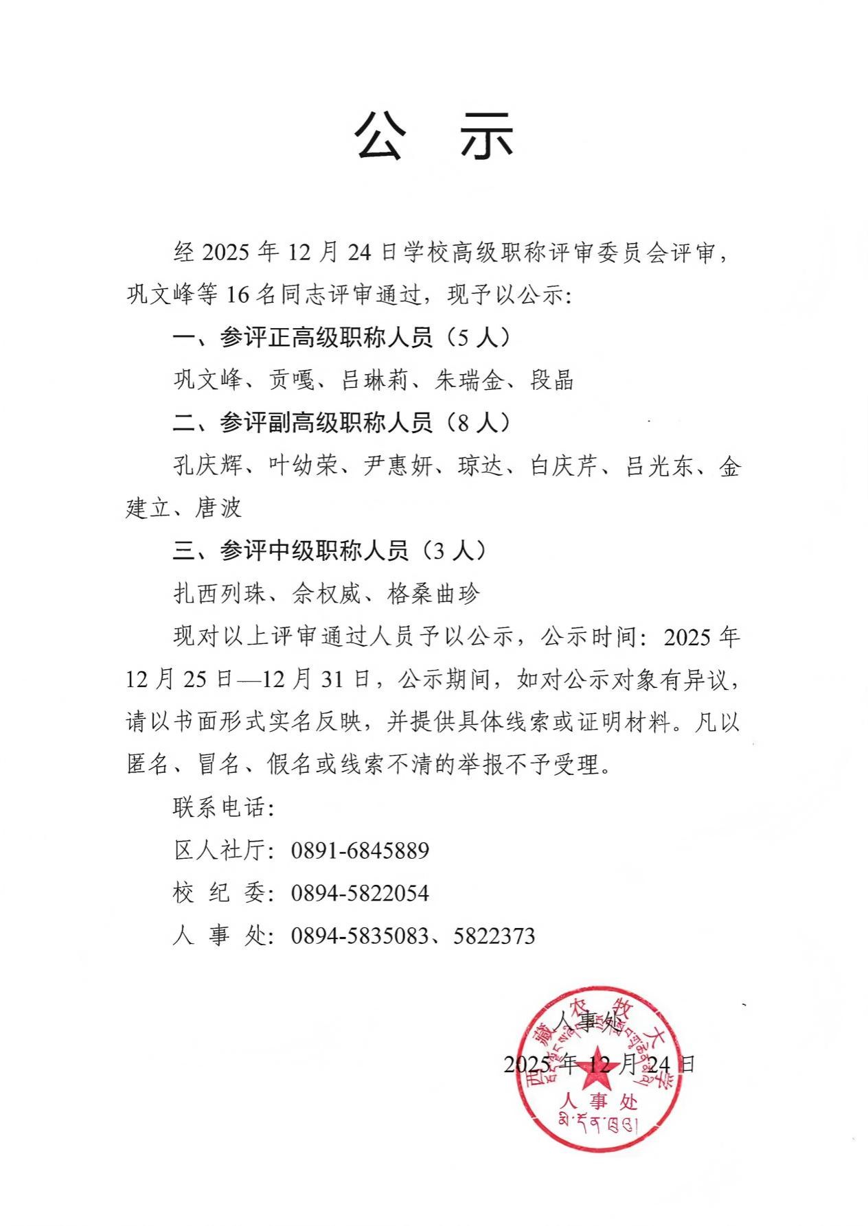 西藏农牧大学2025年度教师系列高级职称评审会评审结果公示