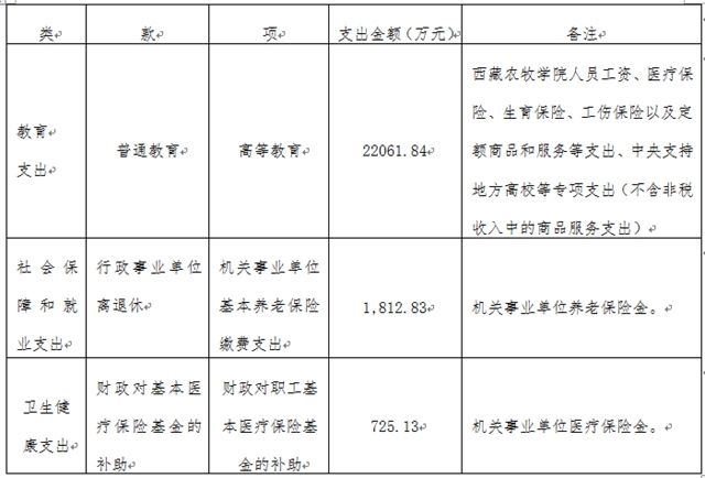 2018年西藏农牧学院一般公共预算支出24,599.80万元,其中:教育支出22,061.84万元,占总支出的89.68%;社会保障和就业支出1,812.83万元,占总支出的7.37%;卫生健康支出725.13万元,占总支出的2.95%。