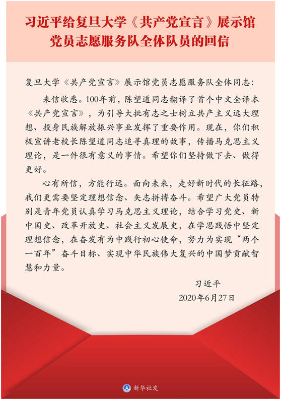 习近平给复旦大学《共产党宣言》展示馆党员志愿服务队全体队员的回信