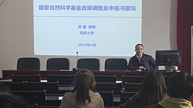 2021年4月14日,同济大学特聘教授刘春,受邀在图书馆三楼学术报告厅开展了关于《国家自然科学基金政策调整及申报书撰写》的讲座。会议由科研处副处长罗红英主持,师生近50人参加此次报告会。