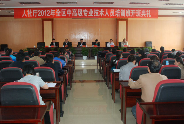 2012年7月26日上午,由自治区人力资源和社会保障厅主办的2012年度全区中高级专业技术人员公需科目培训班在我院开班。自治区人力资源和社会保障厅专技处及我院相关部门负责同志、全体参训学员参加开班典礼。专技处负责同志和我院两名教师分别代表任课教师发言。
