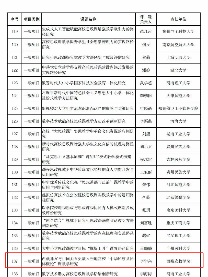 12月12日,2024年度国家社科基金高校思想政治理论课研究项目评审结果公示,思政教研室李华兴老师主持的“西藏地方与祖国关系史融入当地高校‘中华民族共同体概论课’研究”课题获得立项公示,为本年度“国家社科基金高校思想政治理论课研究专项”中西藏高校的唯一项目。同时,也实现了学校思想政治理论课教学科学研究课题立项新的突破。