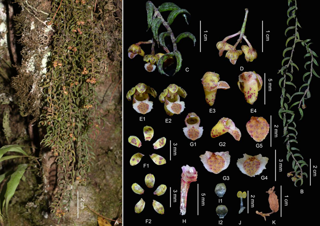 近日,西藏农牧学院邢震教授研究团队与中国科学院西双版纳热带植物园(以下简称“版纳植物园”)罗艳研究员团队在西藏自治区林芝市波密县发现并联合命名了兰科植物一新物种——林芝盆距兰Gastrochilus linzhiensis M.K. Li, Y. Luo & Z. Xing(图1)。这是该团队继毛瓣卷瓣兰Bulbophyllum pilopetalum M. K. Li, J. P. Deng & Y. Luo(图2)后在波密县发现的第2个兰科植物新物种。相关研究以《Gastrochilus linzhiensis (Aeridinae, Vandeae, Epidendroideae, Orchidaceae), a new species from Xizang, China》为题发表在国际著名分类学杂志《Taiwania》上。