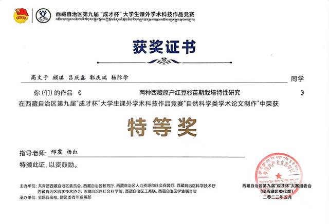 早在2020年9月30日,习近平总书记在联合国生物多样性峰会上就已经提出“生物多样性既是可持续发展基础,也是目标和手段”,党的二十大报告再次强调“尊重自然、顺应自然、保护自然,是全面建设社会主义现代化国家的内在要求”。为树立大学生“人与自然和谐共处”的生态观,培养立志西藏自治区“创建国家生态文明高地,努力做到生态文明建设走在全国前列”的专业人才;资源与环境学院将学生的专业知识与科研兴趣相结合,鼓励学生大胆假设、勇于创新。近5年来,针对两种红豆杉的研究已申报国家级大学生创新项目4项,大学生实训项目2项;发表学术论文5篇,申报实用新型专利1项;2021年《密叶红豆杉人工培育》获自治区第八届“成才杯”大学生课外学术科技作品竞赛自然科学类一等奖,同年该作品获第十七届“挑战杯”全国大学生课外学术科技作品竞赛国赛三等奖;2023年《两种西藏原产红豆杉苗期栽培特性研究》获自治区第九届“成才杯”大学生课外学术科技作品竞赛自然科学类学术论文制作特等奖,现已推送参加第十八届“挑战杯”全国大学生课外学术科技作品竞赛国赛。