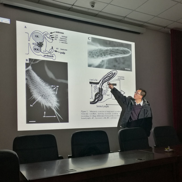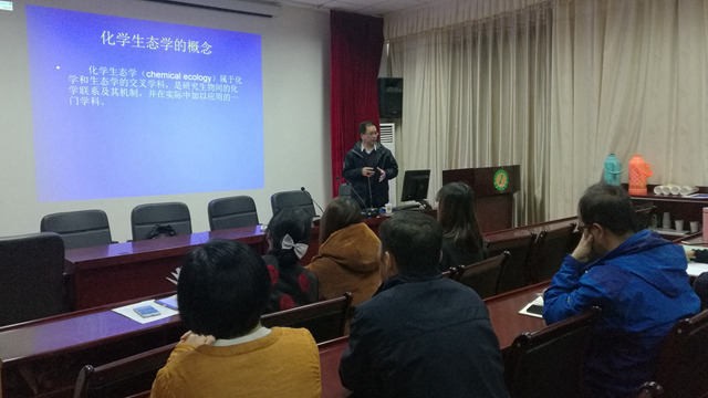 在报告中魏老师指出化学生态学的研究领域包括化学感受机制、昆虫信息素、昆虫与植物的相互关系、植物诱导抗性、三级营养关系、转基因植物化学生态学等9方面。结合自己及团队的研究经历,他重点阐述了化学生态学在天牛-树木-天敌昆虫三级营养、光肩星天牛信息化合物与杨树抗虫机制舞毒蛾天敌昆虫规模化饲养技术研究与天敌行为生态学、沙棘绕实蝇化学生态学与沙棘抗性、基于生物控制的桃红颈天牛管理等一系列研究中的重要作用,基本摸清了栗山天牛、光肩星天牛的生物防治措施及三级营养关系,初步获得了对天牛成虫引诱效果强的法尼烯及其它4种化合物。在报告的最后魏老师提出未来与农牧学院将在预防兽医学、农业(林业、果树)害虫综合管理及沙棘优良品系分子育种三个领域开展合作。